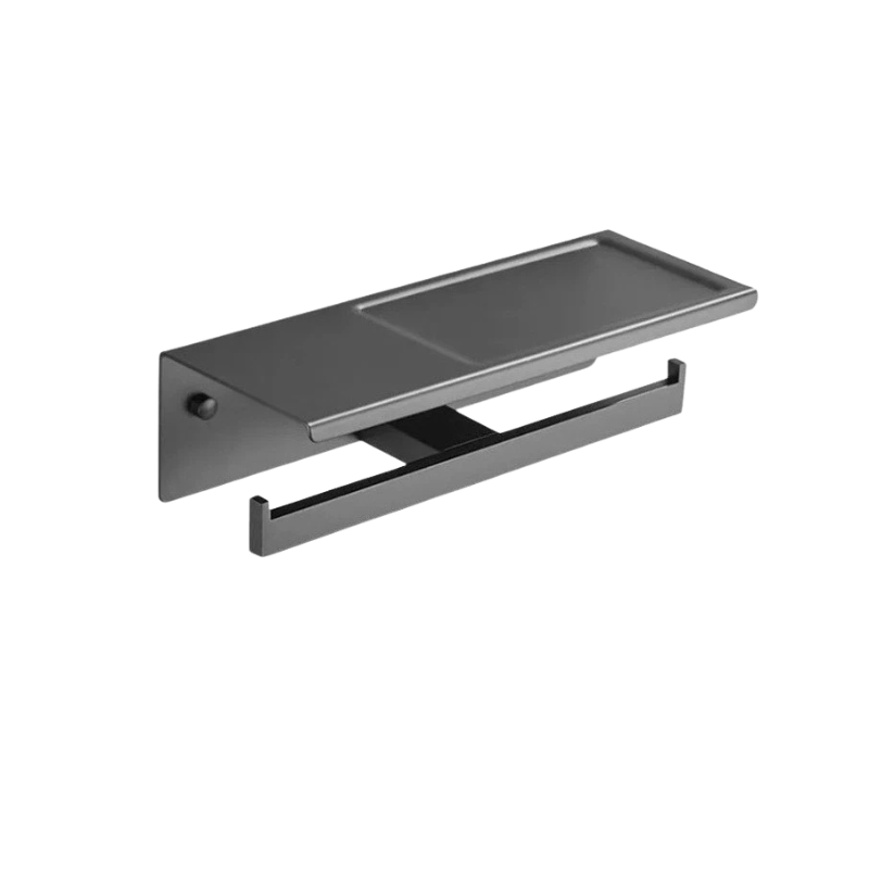 Strakke dubbele wc-rolhouder in gun metal afwerking. Het lange draagprofiel biedt ruimte voor twee rollen naast elkaar en het bovenplankje met opstaande rand is handig voor telefoon, doekjes of geursticks.