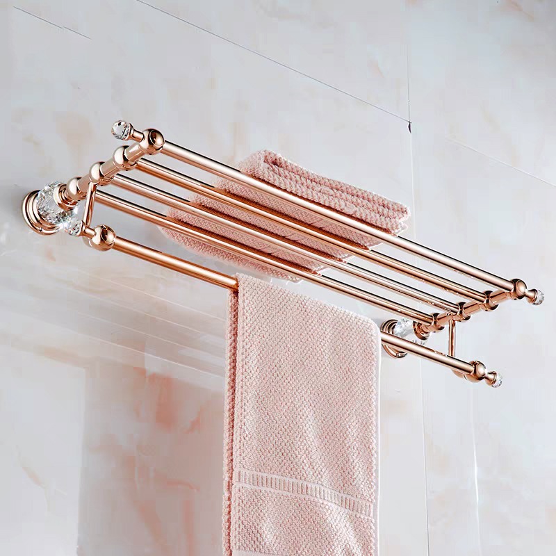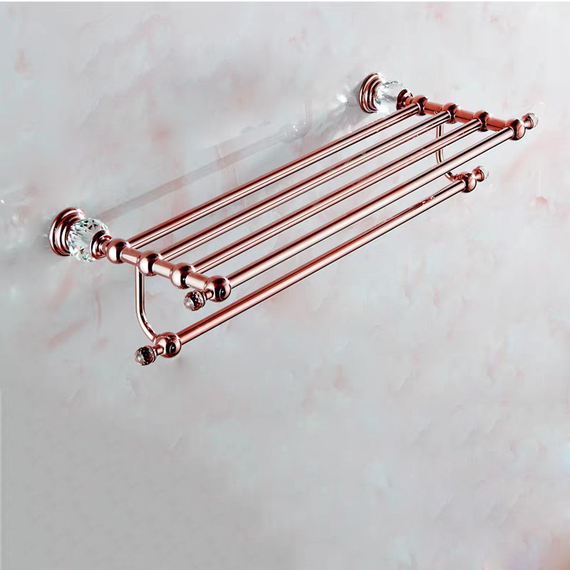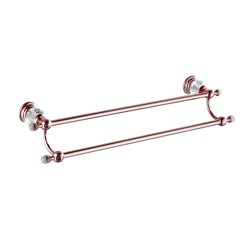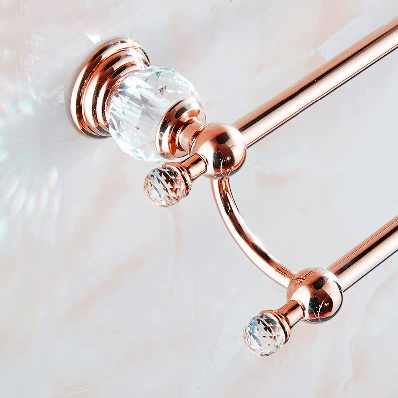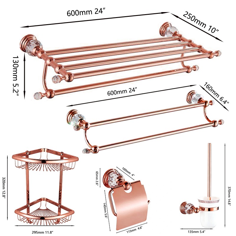 Roségouden badkamer accessoireset 5-delig met handdoekrek, dubbele handdoekstang, 2-laags hoekdouchemand, toiletrolhouder met klep en wc-borstelhouder. Sterk metaal, klassiek design, kristalaccenten en 2 jaar garantie. Perfect voor een luxe badkamer.