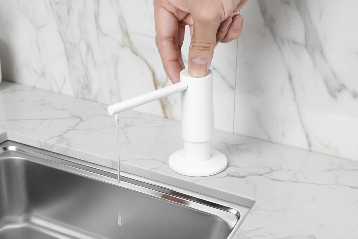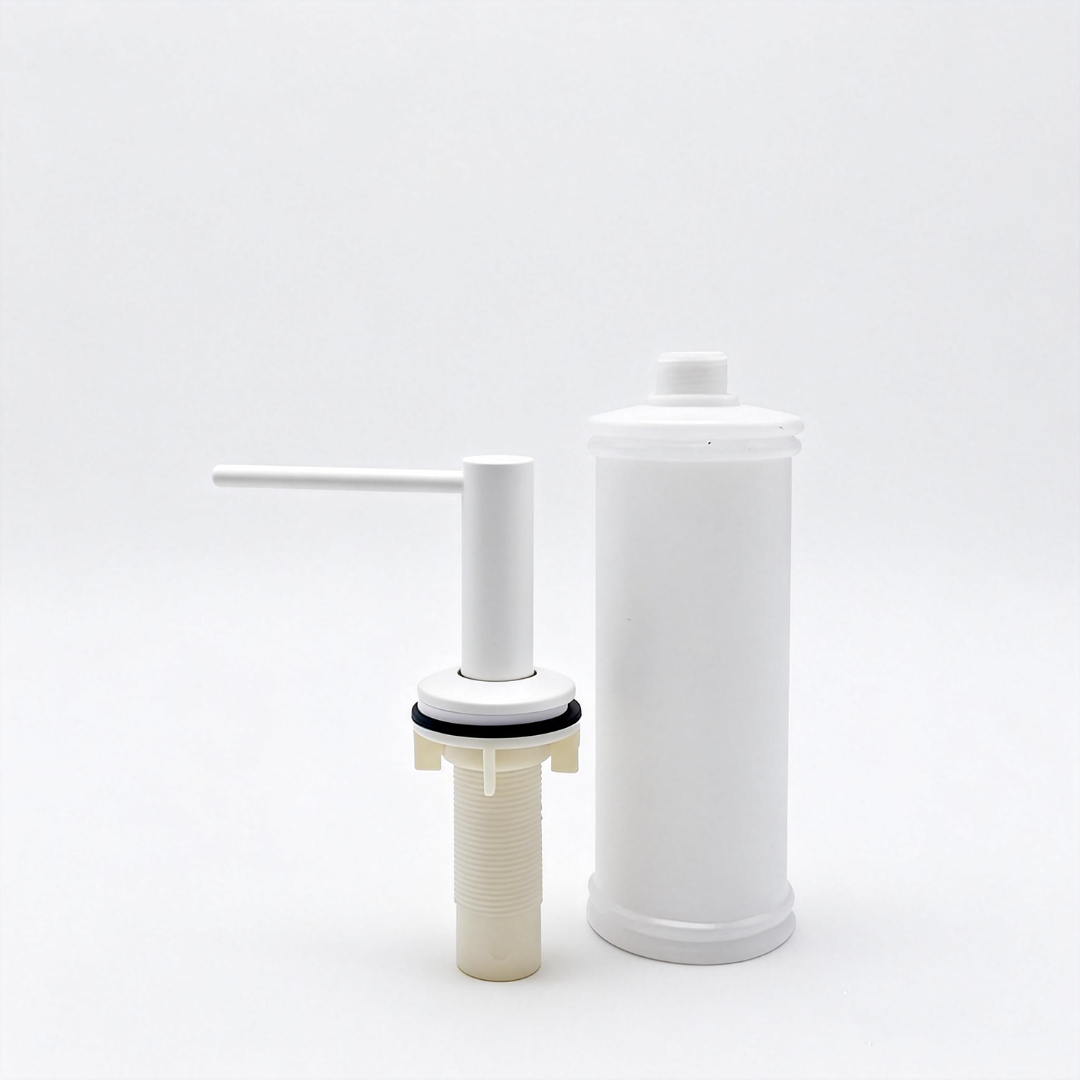 Deze stijlvolle inbouw zeepdispenser in witte afwerking is een perfecte aanvulling voor een moderne keuken of badkamer. De frisse en tijdloze uitstraling combineert moeiteloos met lichte werkbladen en minimalistische interieurs.