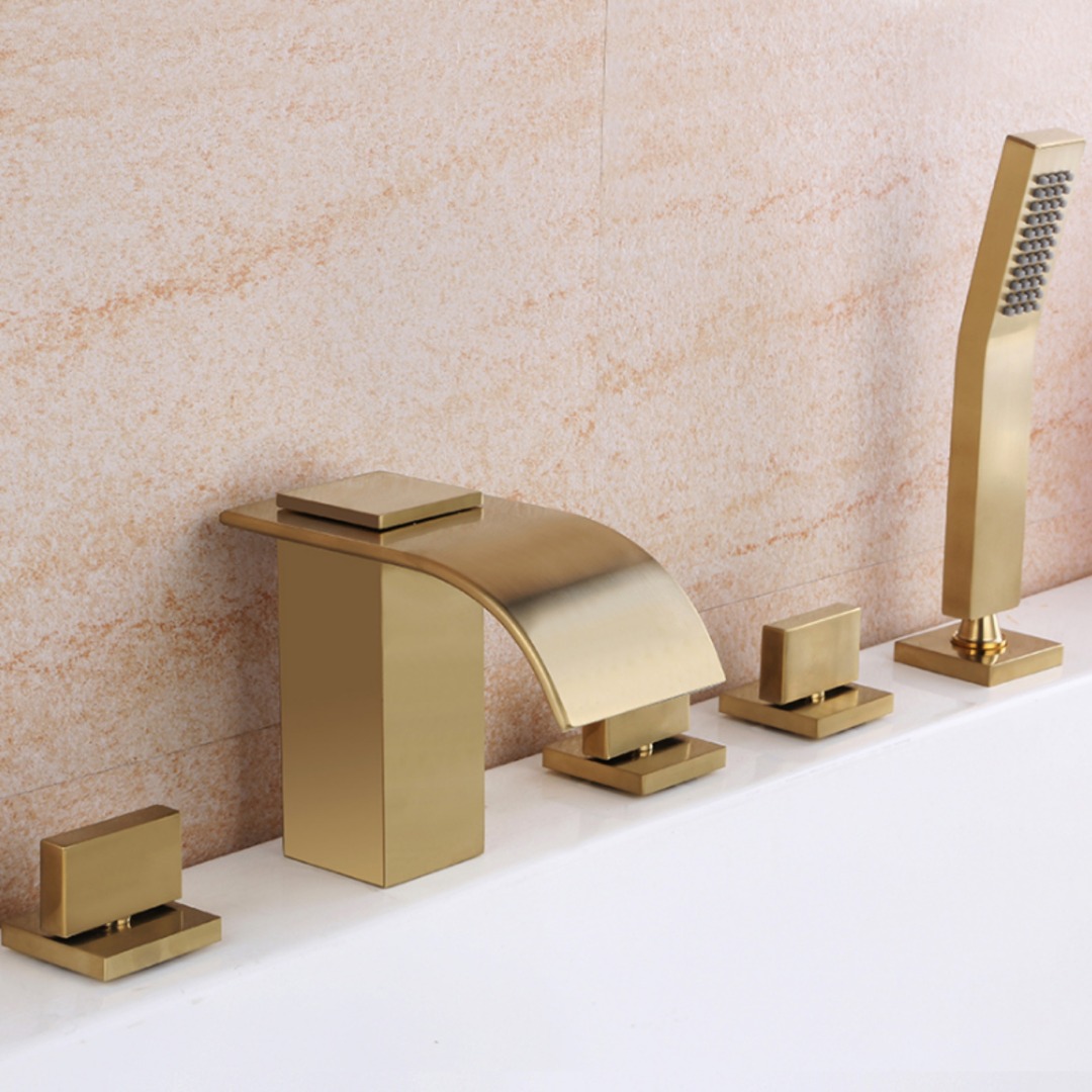 Deze moderne 5-delige waterval badkraan in geborsteld goud geeft uw badkamer een luxe, strakke uitstraling. De brede uitloop zorgt voor een zachte watervalstraal en de set wordt geleverd met een bijpassende handdouche voor extra gebruiksgemak.