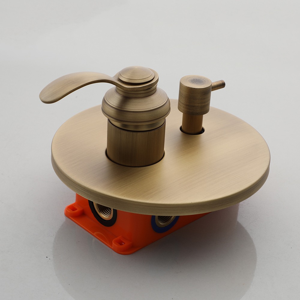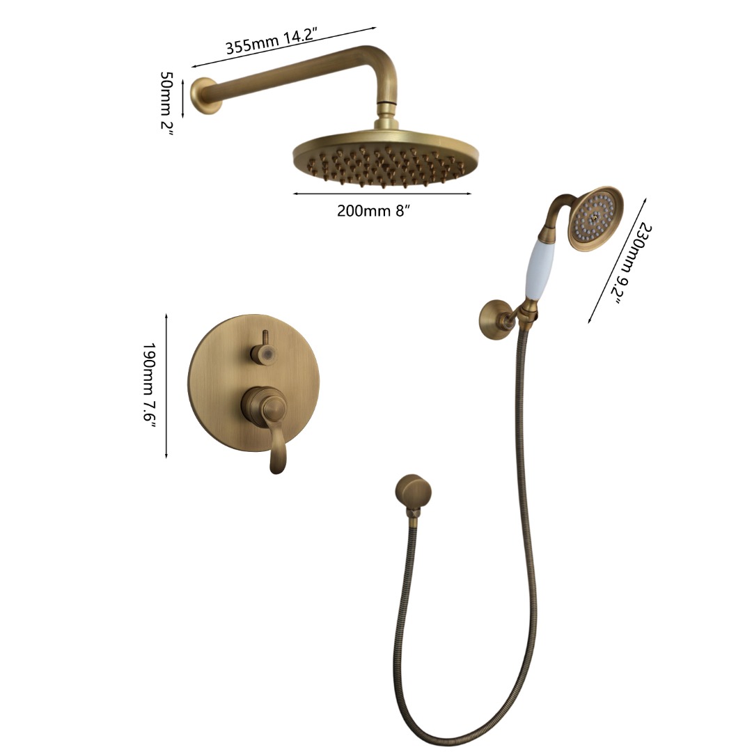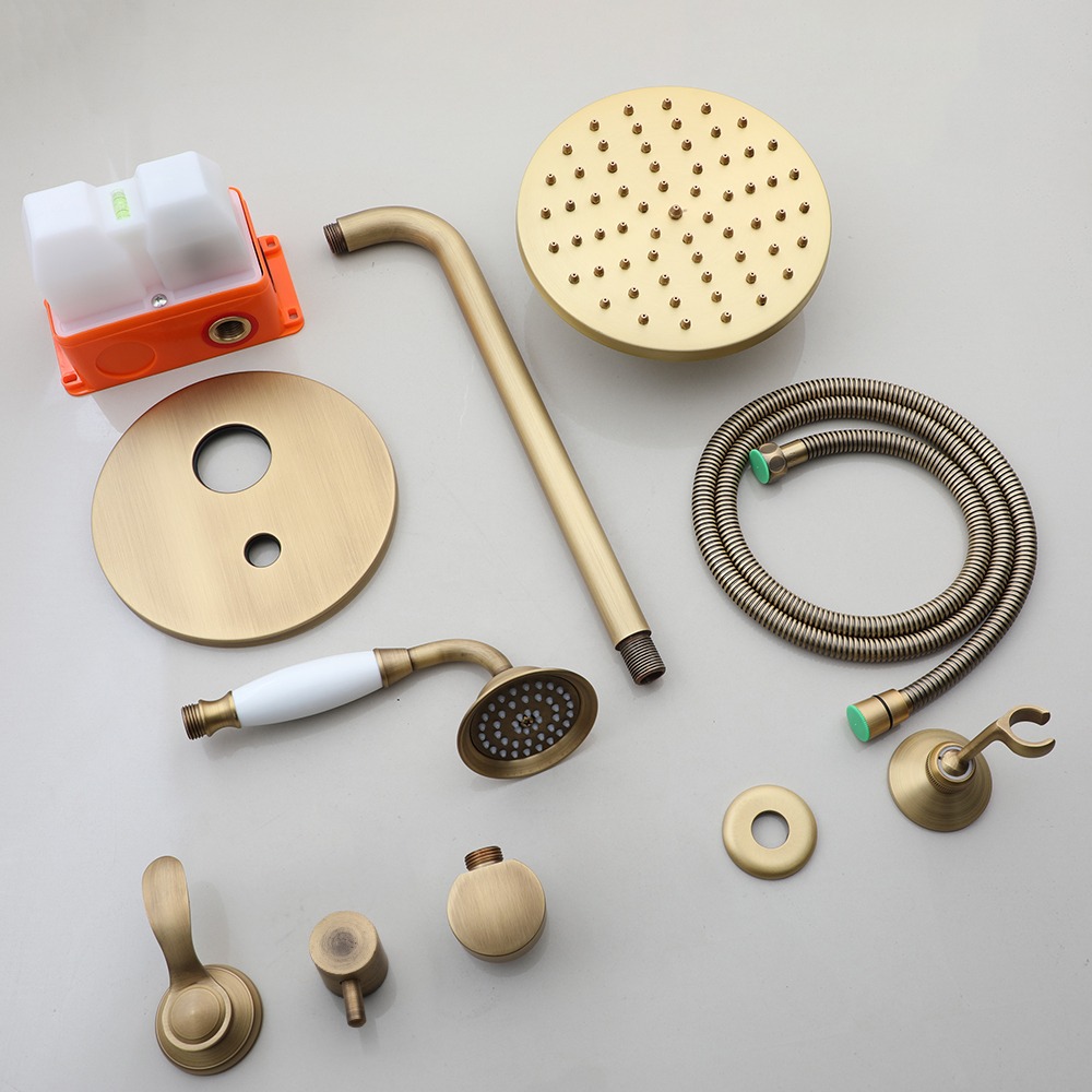 Karaktervolle, nostalgische doucheset voor de landelijke badkamer. De set is uitgevoerd in bronskleur en bestaat uit een royale regendouche, handdouche en inbouw mengkraan met omsteller. Massief messing en een soepel keramisch binnenwerk zorgen voor een solide bediening en lange levensduur.