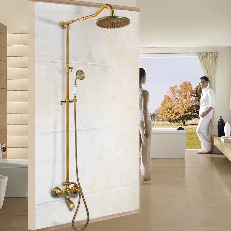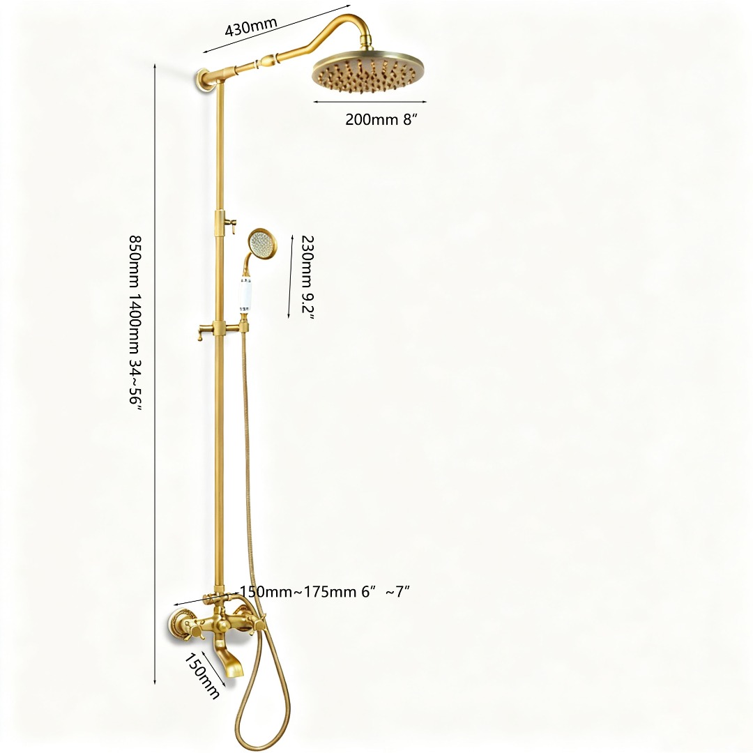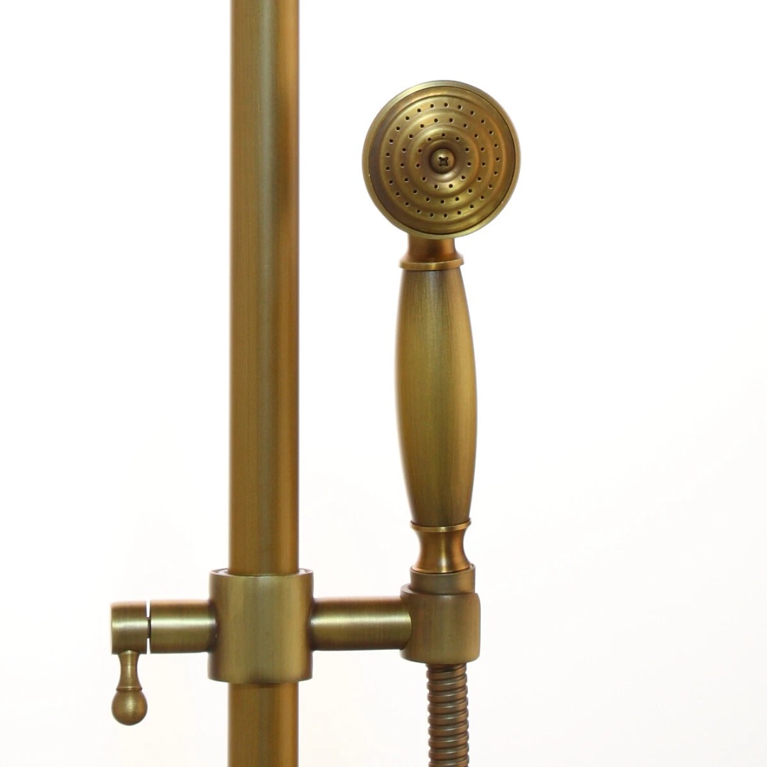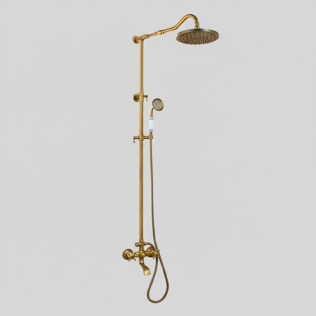 Geef je badkamer een warme, klassieke uitstraling met deze nostalgische opbouw regendoucheset in brons. De set is vervaardigd uit massief messing voor een lange levensduur en combineert een comfortabele regendouche met een bijpassende handdouche en baduitloop. Ideaal voor landelijke en retro interieurs.