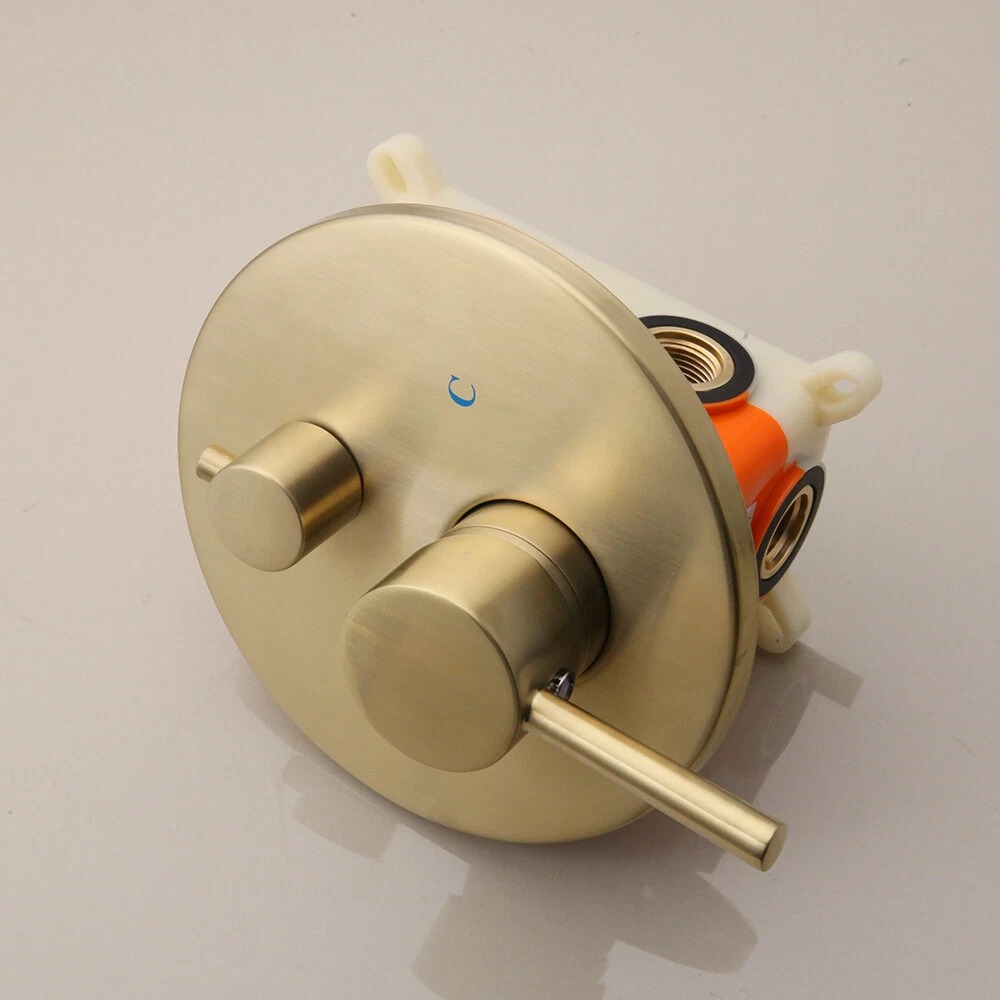 Geef je douche een luxe upgrade met deze inbouw doucheset in geborsteld goud. De set combineert een strakke ronde regendouche met een comfortabele handdouche en een minimalistisch bedieningspaneel.