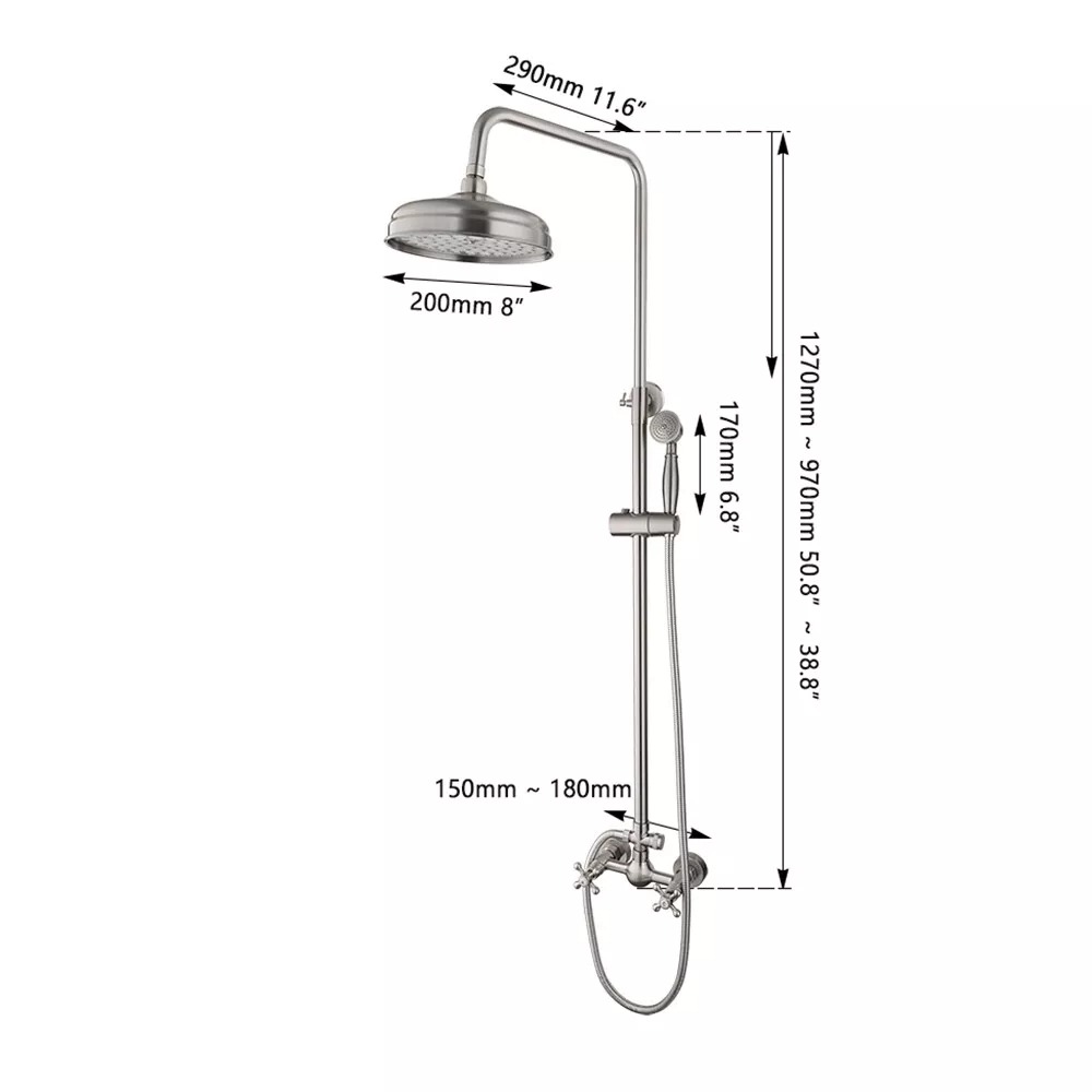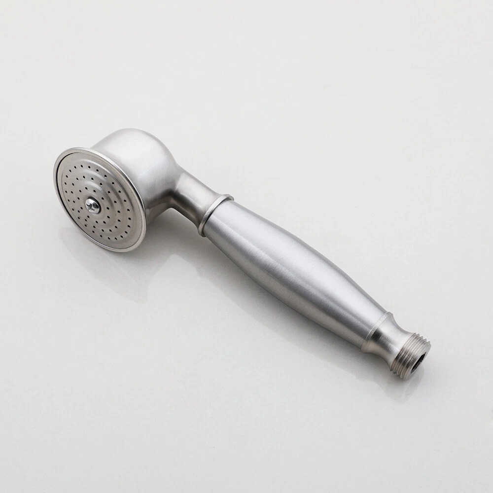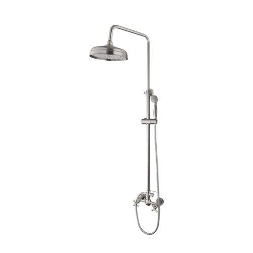 Stijlvolle nostalgische opbouw regendouche in geborsteld nikkel. Vervaardigd uit massief messing met keramische schijven voor een soepele, duurzame bediening.