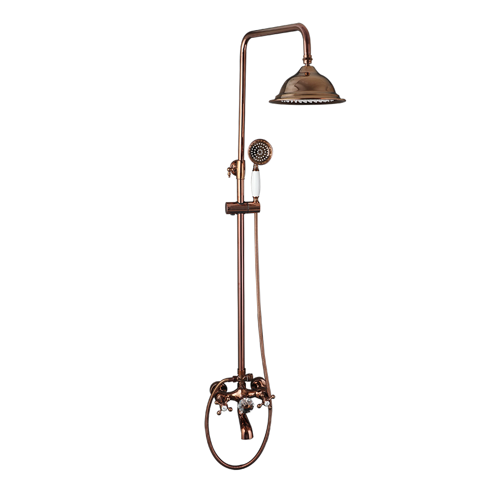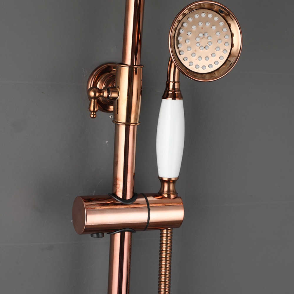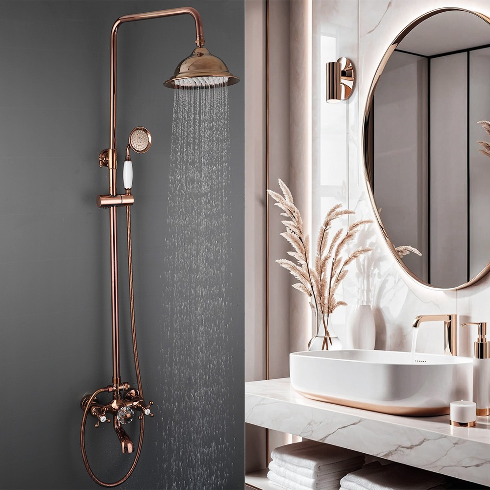 Maak van je badkamer een hotelwaardige wellnessruimte met deze roségouden opbouw regendouche. De set combineert een royale regendouche met een klassieke mengkraan en handdouche – allemaal uitgevoerd in een warme roségouden afwerking. Robuust messing, tijdloos design en comfortabel douchen in één.