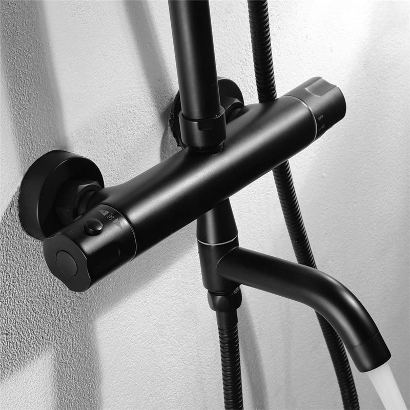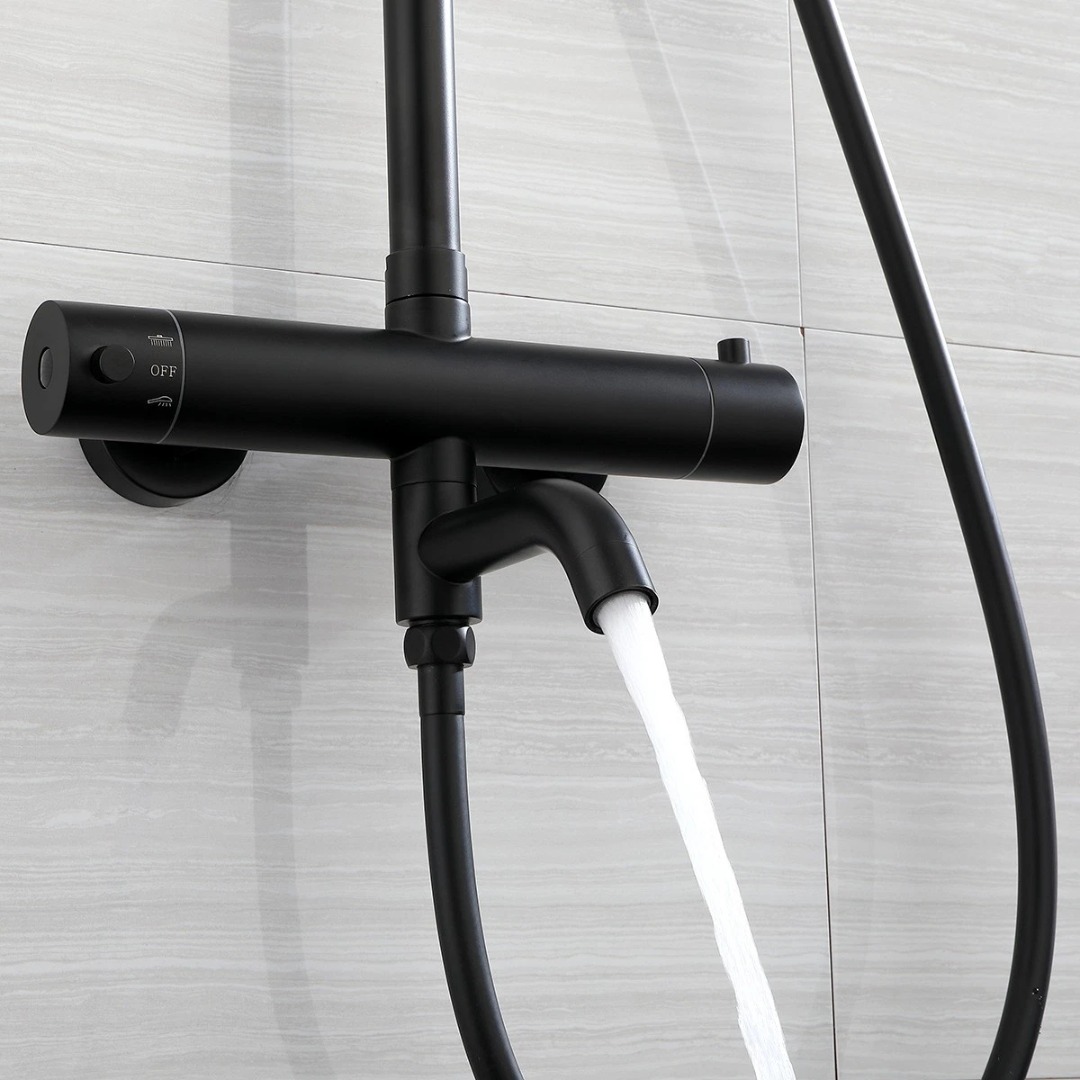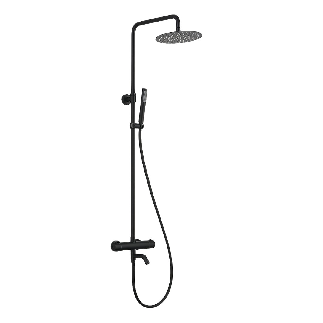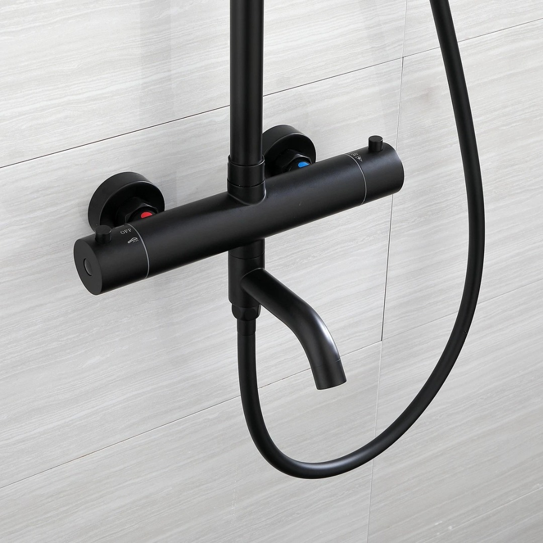 Strakke, matzwarte opbouw regendouche met thermostatische mengkraan. De set combineert een brede regendouche met een handdouche en is ideaal voor een moderne, minimalistische badkamer.