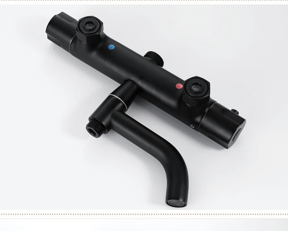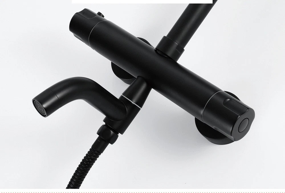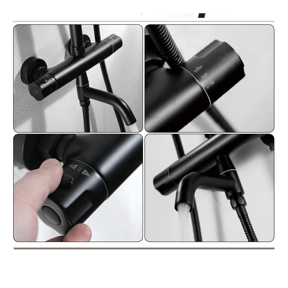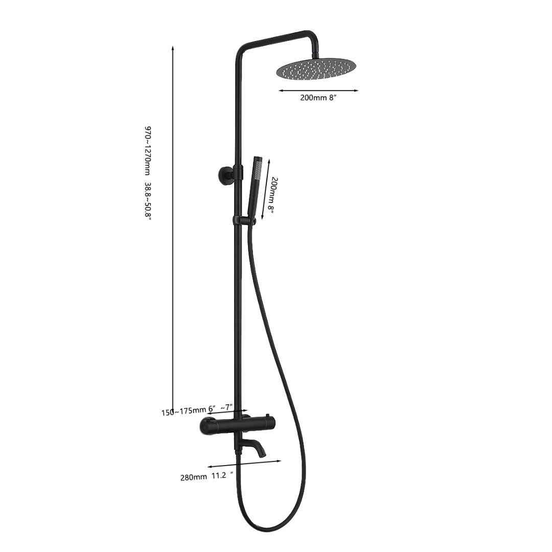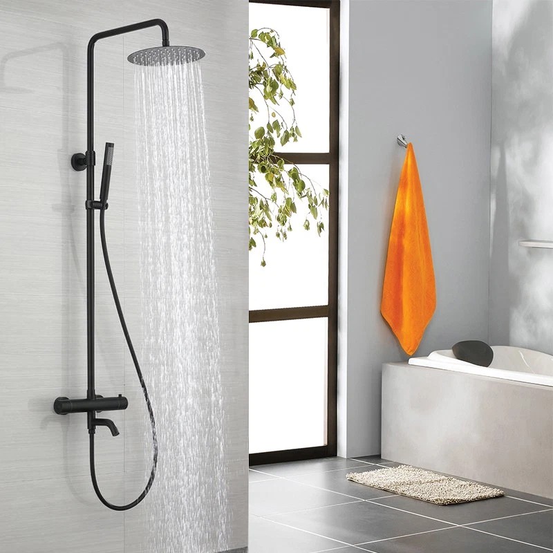 Strakke, matzwarte opbouw regendouche met thermostatische mengkraan. De set combineert een brede regendouche met een handdouche en is ideaal voor een moderne, minimalistische badkamer.