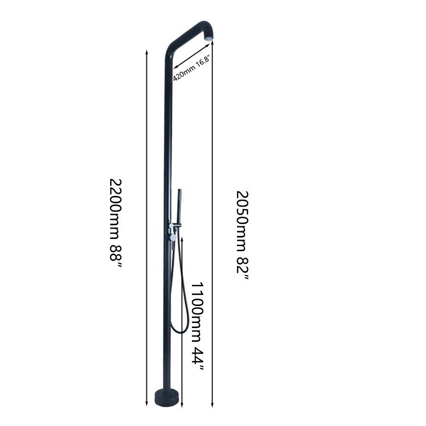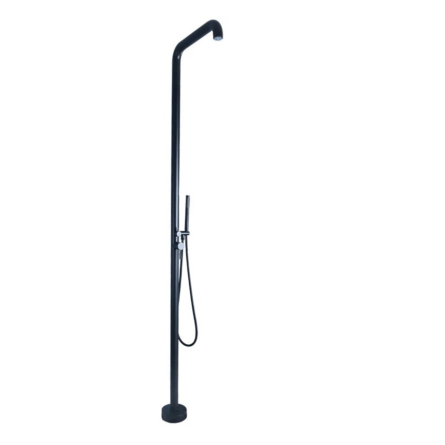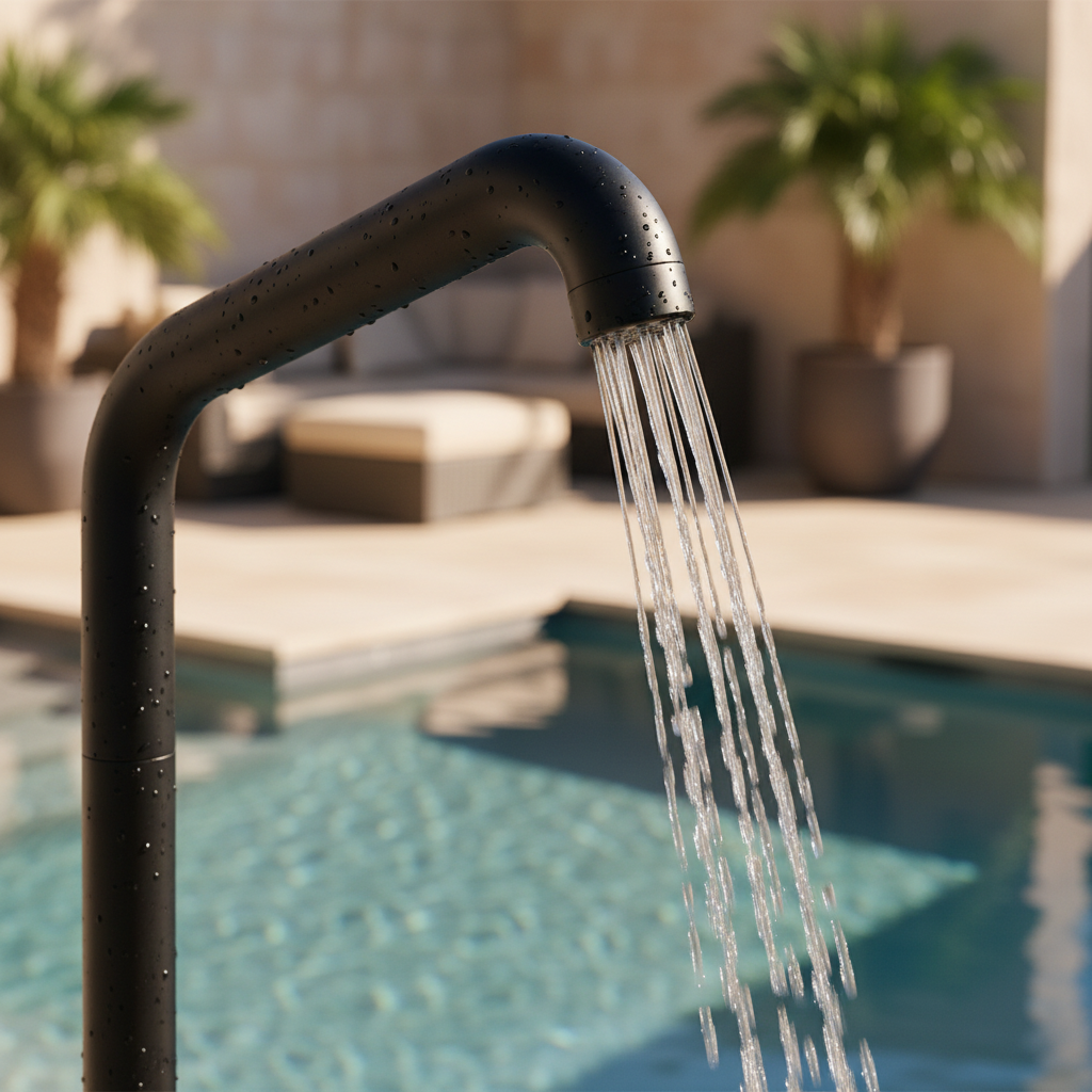 De douche is vervaardigd uit hoogwaardig RVS en afgewerkt in een stijlvolle mat zwarte coating. Deze afwerking zorgt voor een strakke, eigentijdse uitstraling en biedt uitstekende bescherming tegen weersinvloeden en intensief buitengebruik. Perfect voor moderne tuinen, architectonische buitenruimtes en luxe wellnessomgevingen.