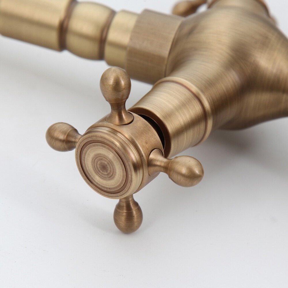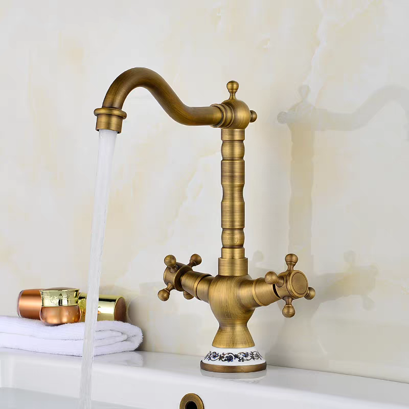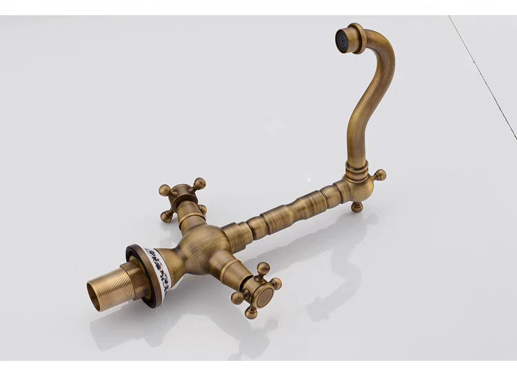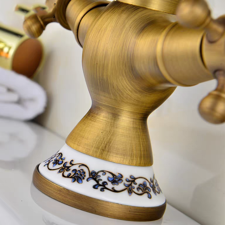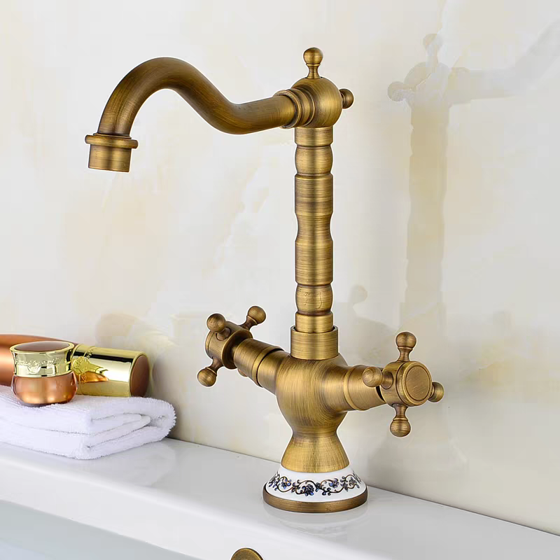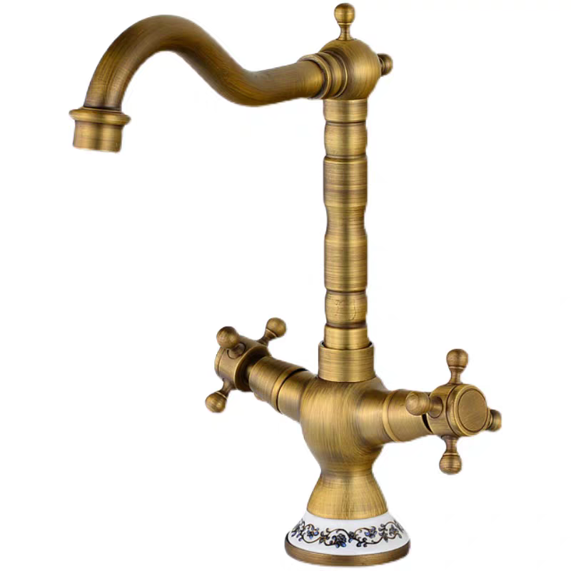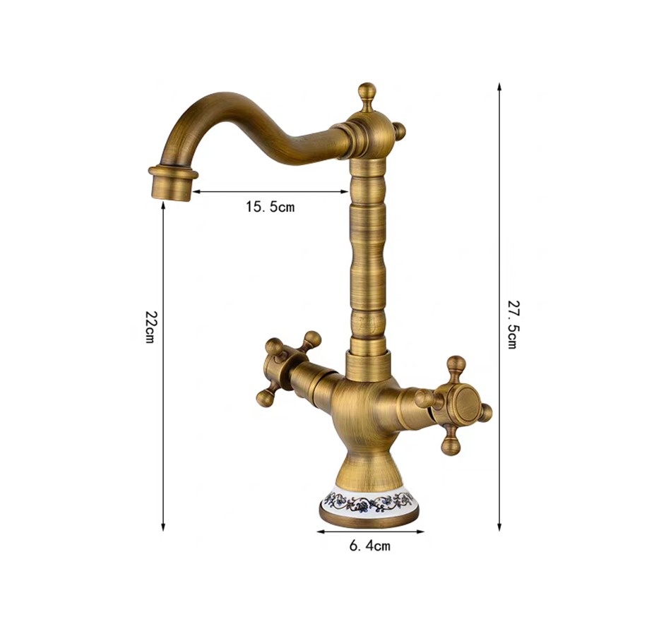 Deze landelijke en nostalgische keukenkraan in warme bronskleur is een echte blikvanger in iedere klassieke of landelijke keuken. De verfijnde keramiek versiering op de voet geeft de kraan een authentieke uitstraling met een subtiel decoratief accent.