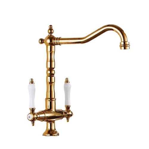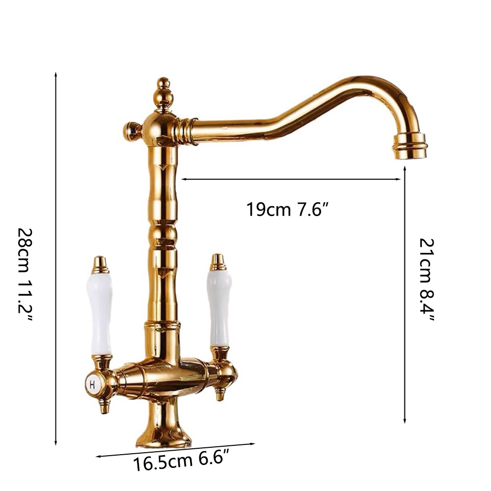 Breng warme, tijdloze klasse in je keuken met deze goudkleurige keukenkraan in klassieke stijl. De kraan is uitgevoerd met twee porseleinen hendels voor warm en koud water en een sierlijke hoge uitloop, ideaal voor dagelijks gebruik in landelijke en retro keukens.