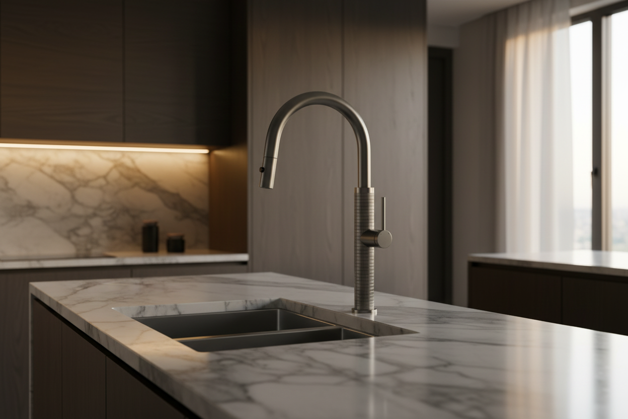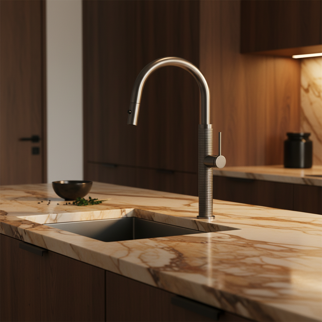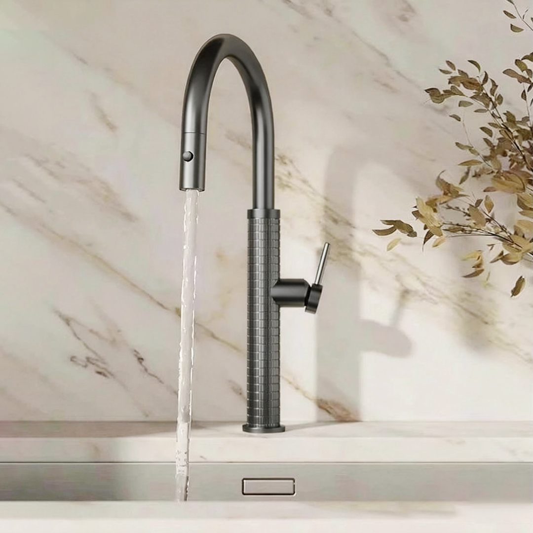 Deze gun metal keukenkraan combineert een luxe uitstraling met maximale functionaliteit. De hoge U-vormige uitloop en de uittrekbare sproeikop maken deze kraan ideaal voor dagelijks gebruik in moderne en industriële keukens.