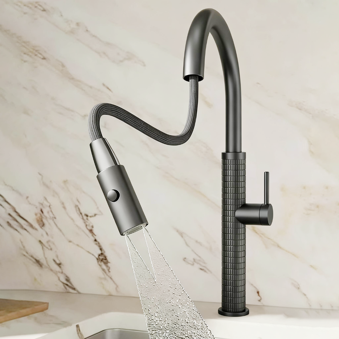 Bestel vandaag nog en ervaar het comfort van een luxe gun metal keukenkraan met uittrekbare sproeikop en veelzijdige waterstanden.