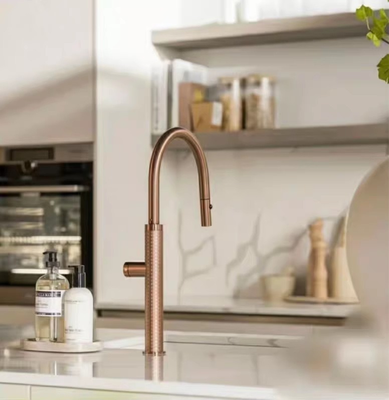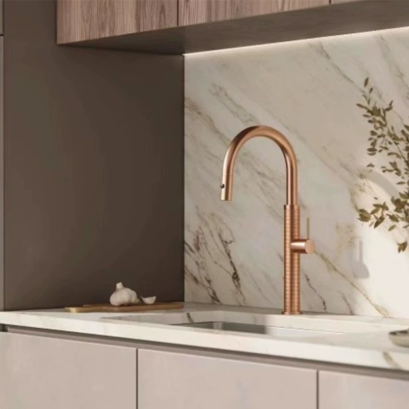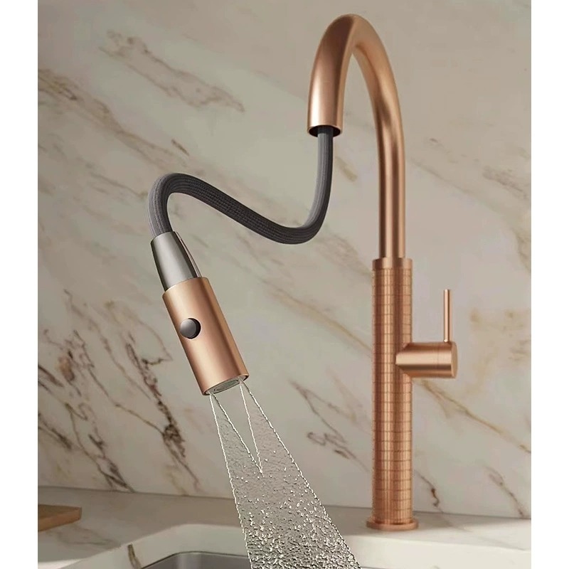 Deze rosé gouden keukenkraan combineert een luxe en warme uitstraling met praktische functionaliteit. De hoge U-vormige uitloop en de uittrekbare sproeikop zorgen voor optimaal gebruiksgemak in zowel moderne als elegante keukens.