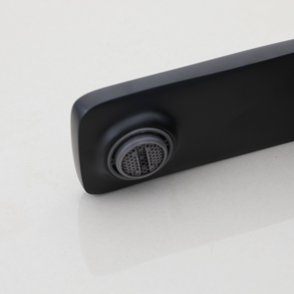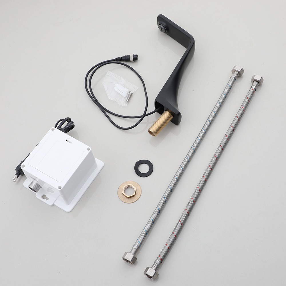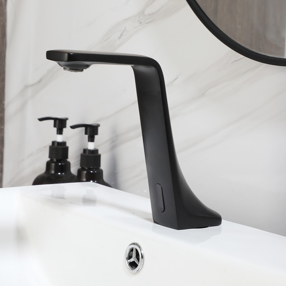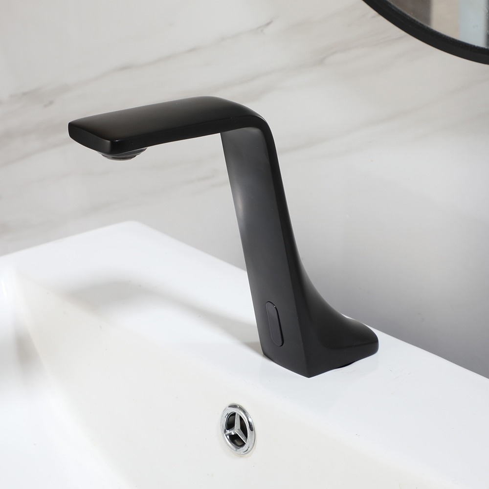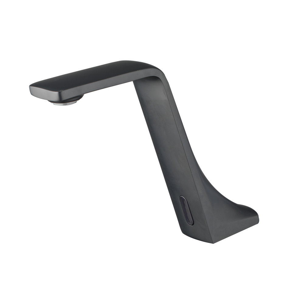 Strakke, matzwarte sensorkraan met infrarooddetectie. Dit is het koud model: direct op koud water aan te sluiten. Met de optionele Sensomatica warmteregelaar maak je de kraan geschikt voor warm of gemengd water—zonder zichtbare aanpassingen aan de kraan.