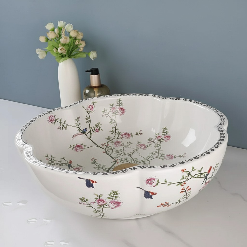 Deze elegante keramische waskom van het merk Malvizza brengt een vleugje luxe en landelijke charme in iedere badkamer. De kom is handgedecoreerd met subtiele bloemmotieven en een verfijnde randafwerking, wat zorgt voor een tijdloze en stijlvolle uitstraling.