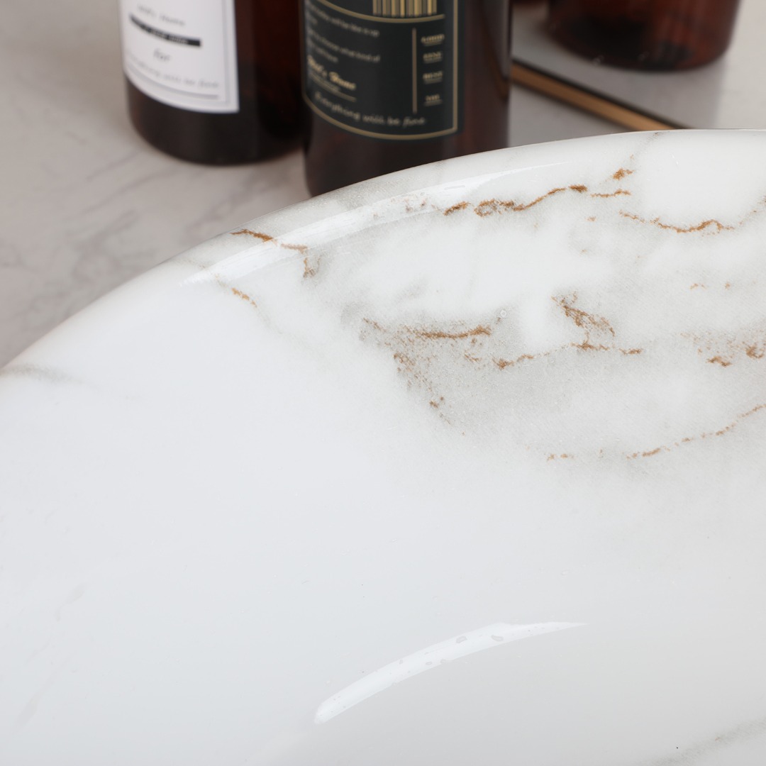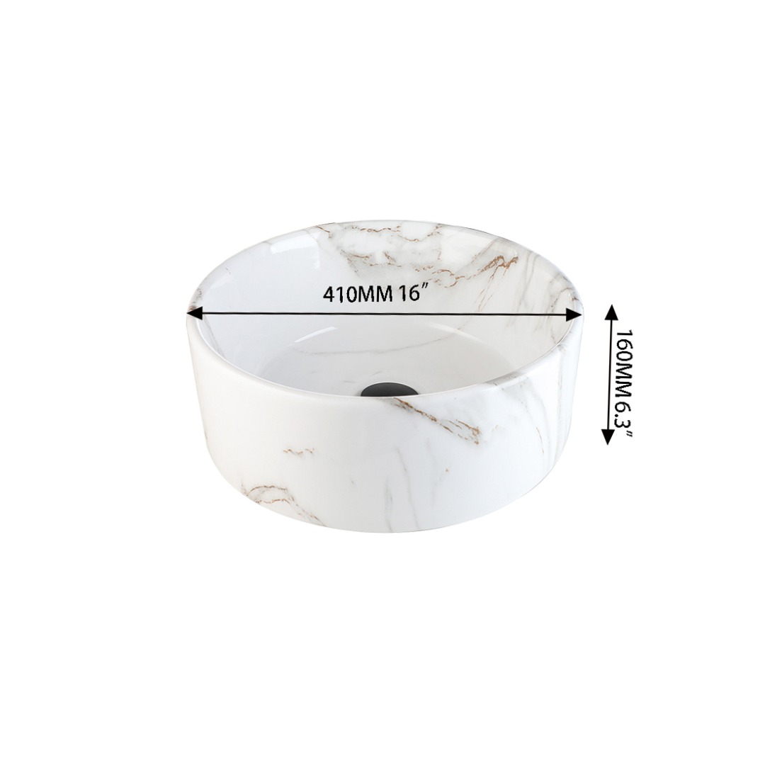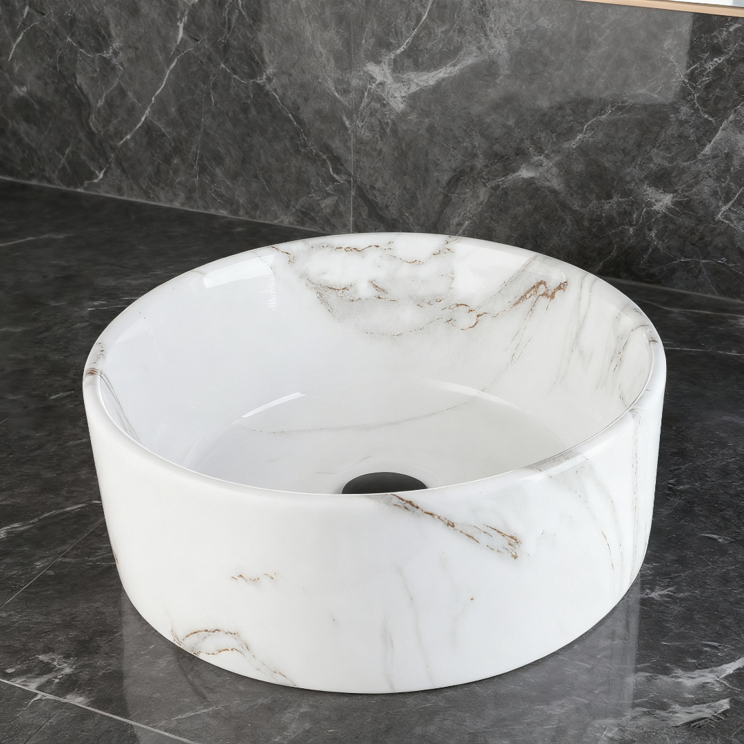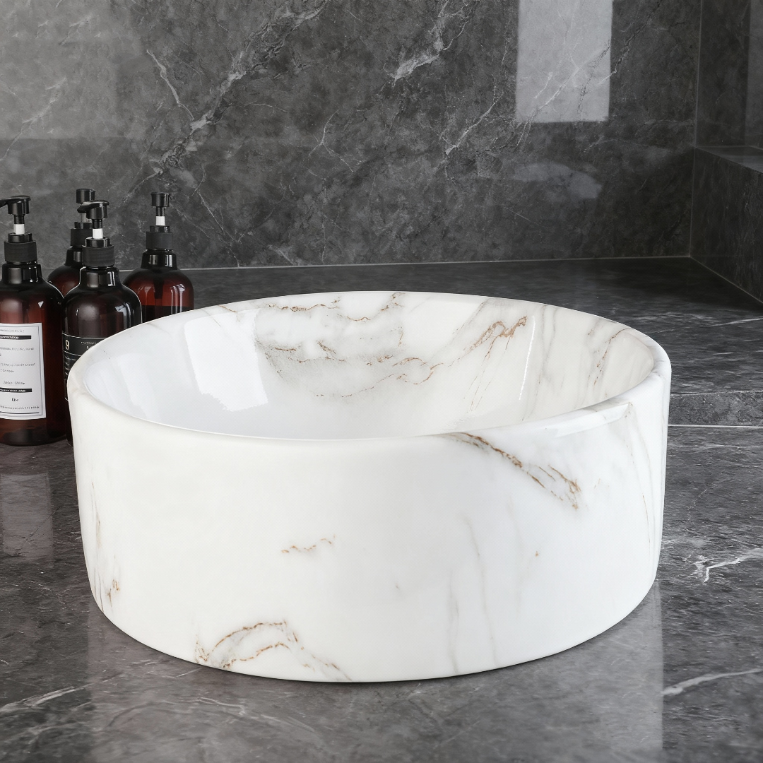 Breng een stijlvolle en moderne uitstraling in je badkamer met deze ronde keramische waskom van Malvizza. De waskom heeft een elegante witte marmerlook met subtiele grijze en goudbruine aders, waardoor hij perfect combineert met zowel moderne als klassieke interieurs.