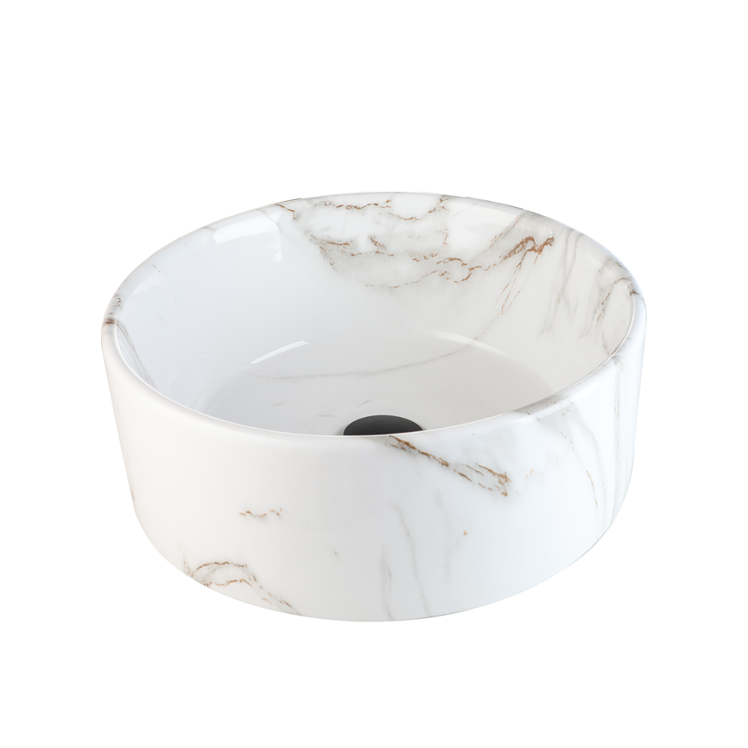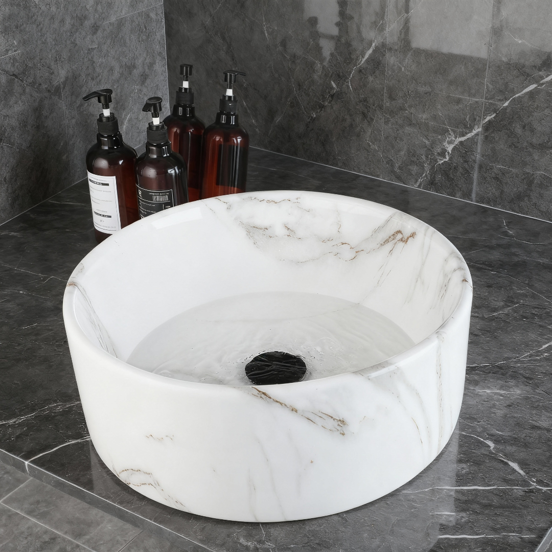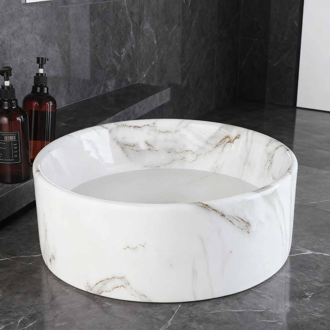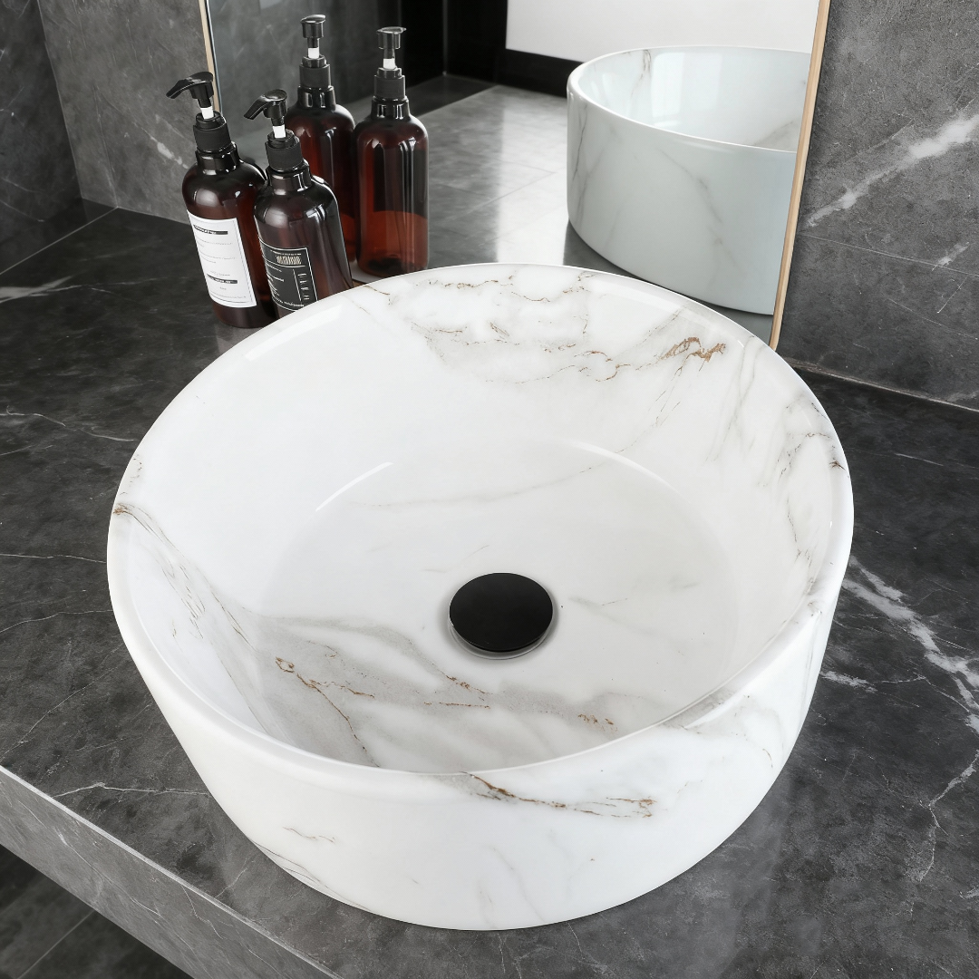 Breng een stijlvolle en moderne uitstraling in je badkamer met deze ronde keramische waskom van Malvizza. De waskom heeft een elegante witte marmerlook met subtiele grijze en goudbruine aders, waardoor hij perfect combineert met zowel moderne als klassieke interieurs.