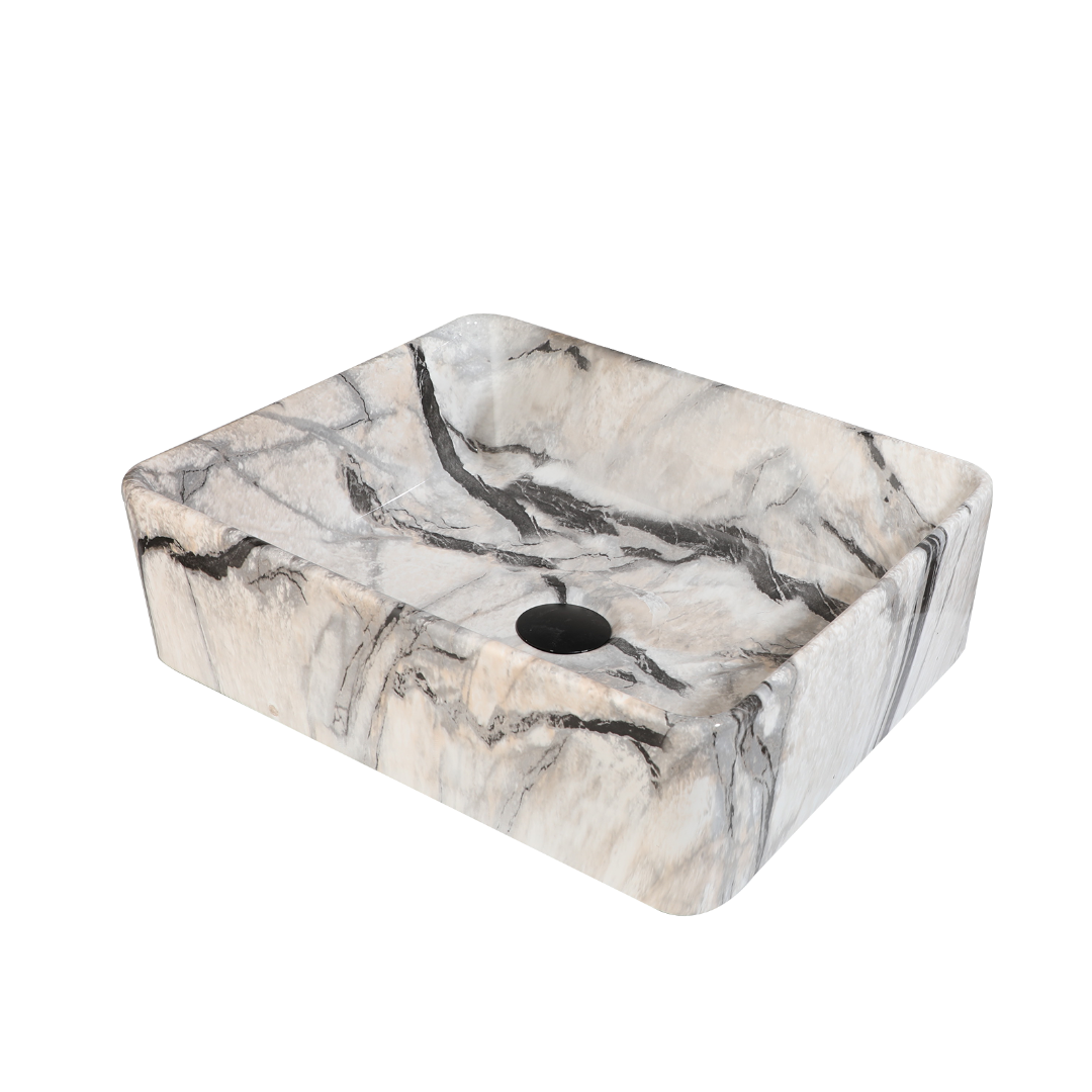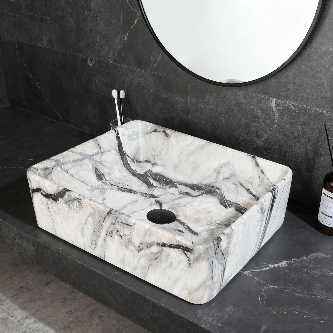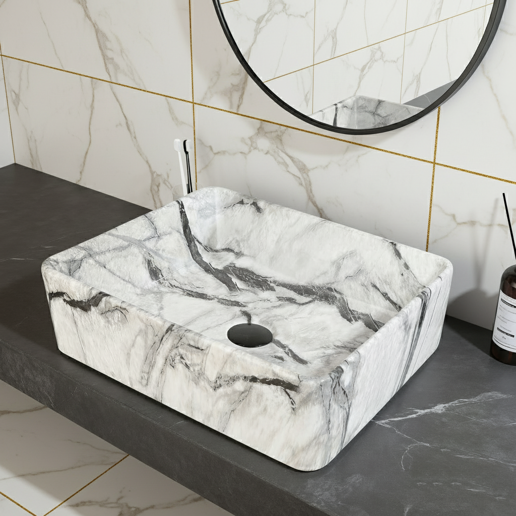 Deze luxe waskom van het merk Malvizza heeft een elegante marmerlook met natuurlijke grijs- en wittinten. De moderne rechthoekige vorm geeft de waskom een stijlvolle en tijdloze uitstraling, perfect voor zowel moderne als klassieke badkamers. Gemaakt van hoogwaardig keramiek, eenvoudig te reinigen en bestand tegen dagelijks gebruik.