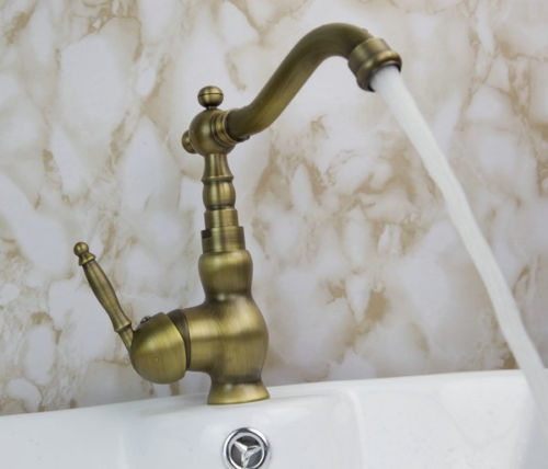 Mooie nostalgische wastafelkraan welke antiek bronskleurig is afgewerkt: