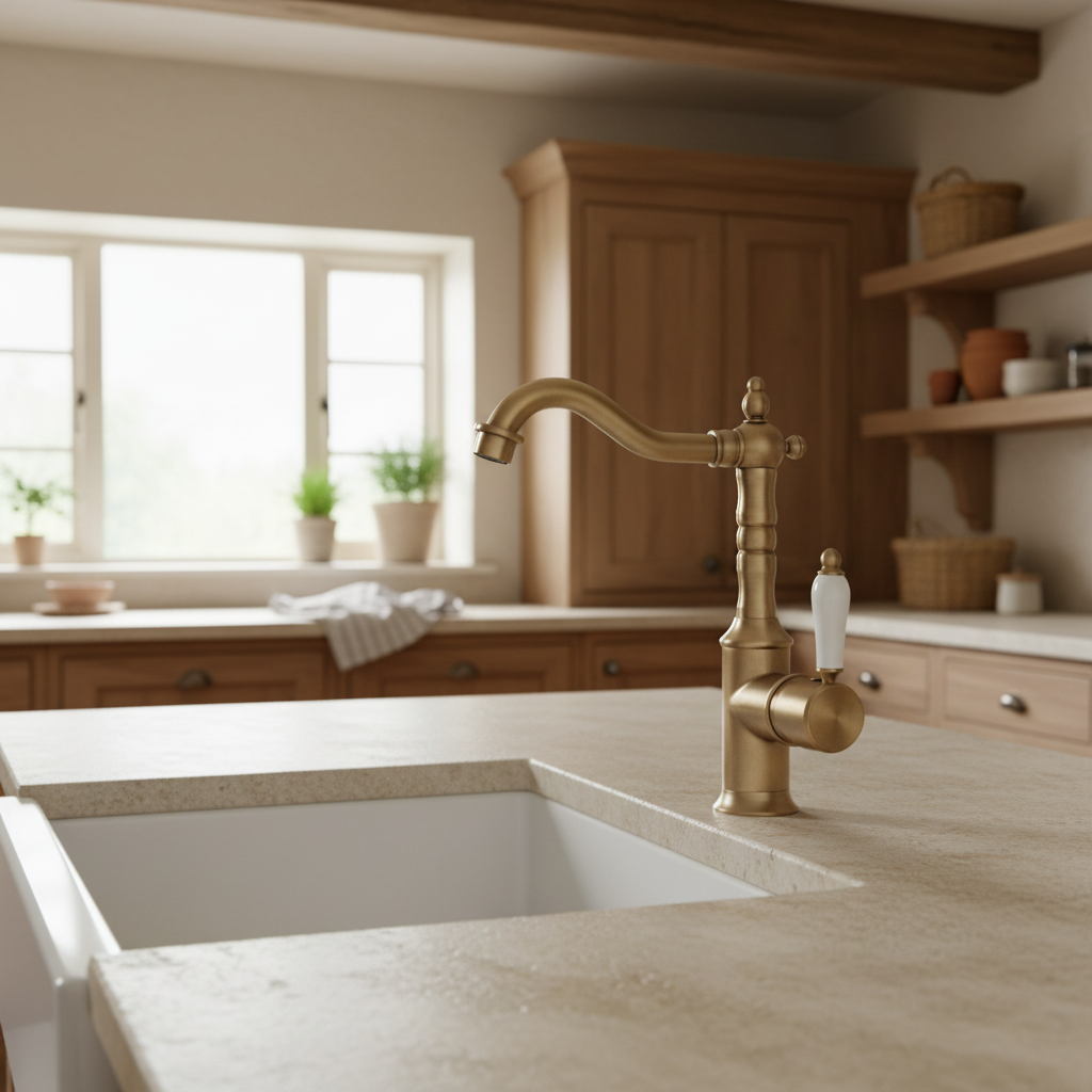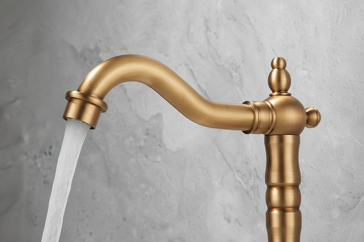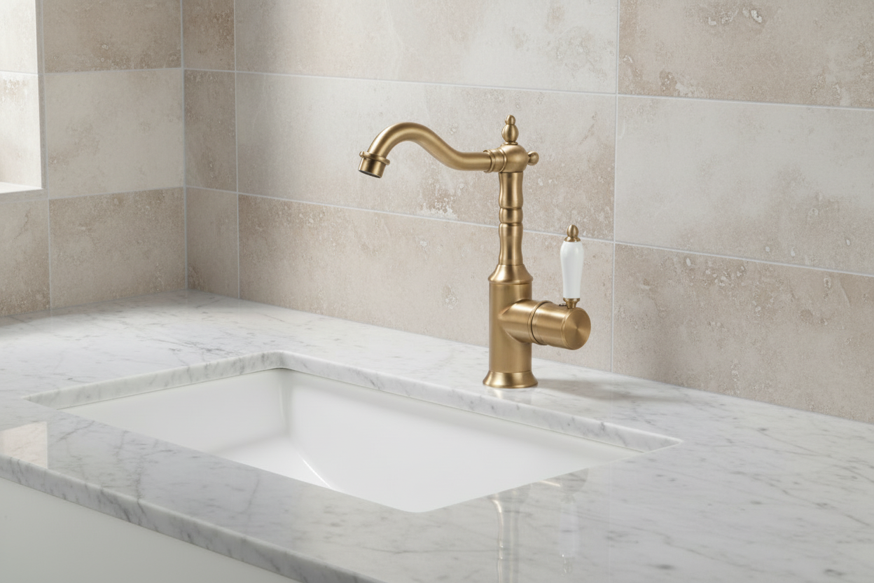 Bestel vandaag nog en geef je badkamer of keuken een warme, landelijke uitstraling met deze nostalgische bronskleurige wastafelkraan.