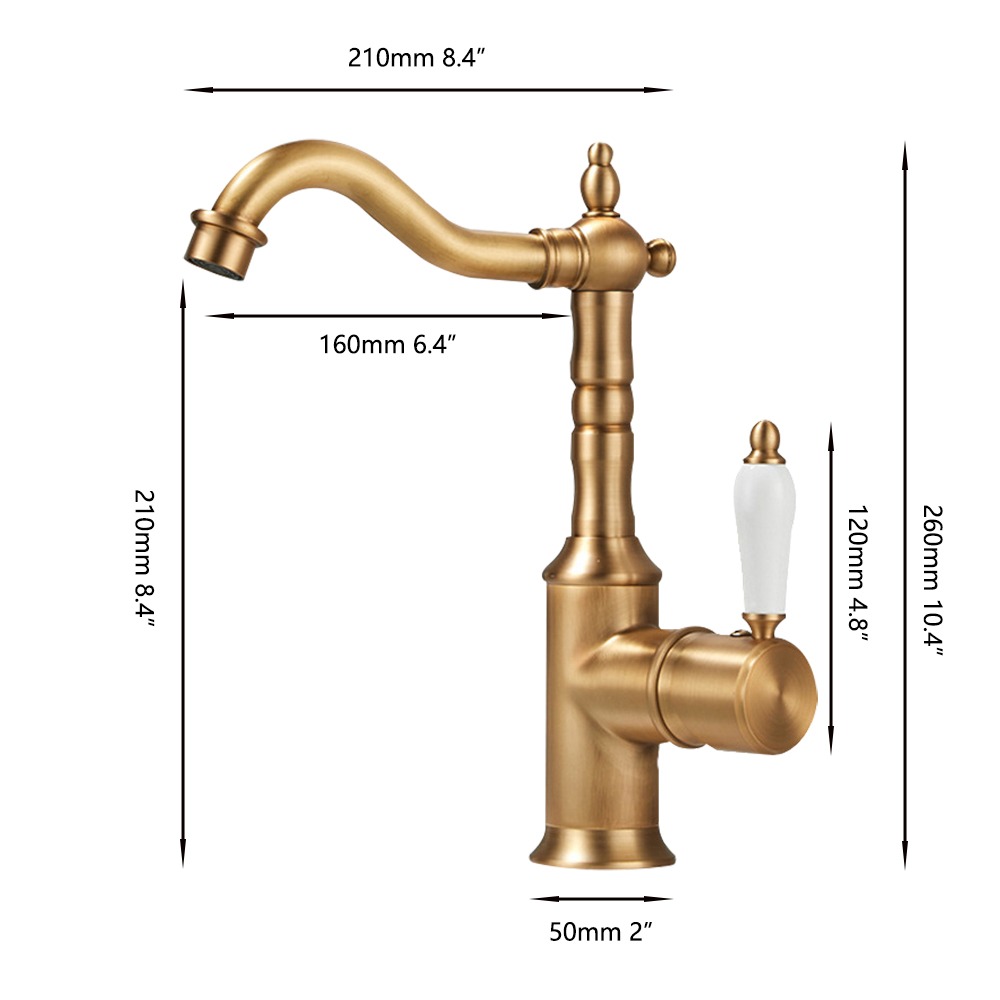 Deze landelijke wastafelkraan in bronskleur brengt een warme, nostalgische sfeer in de badkamer of keuken. De sierlijk gebogen uitloop, klassieke details en porseleinen hendel zorgen voor een authentieke uitstraling die perfect past bij landelijke en klassieke interieurs.