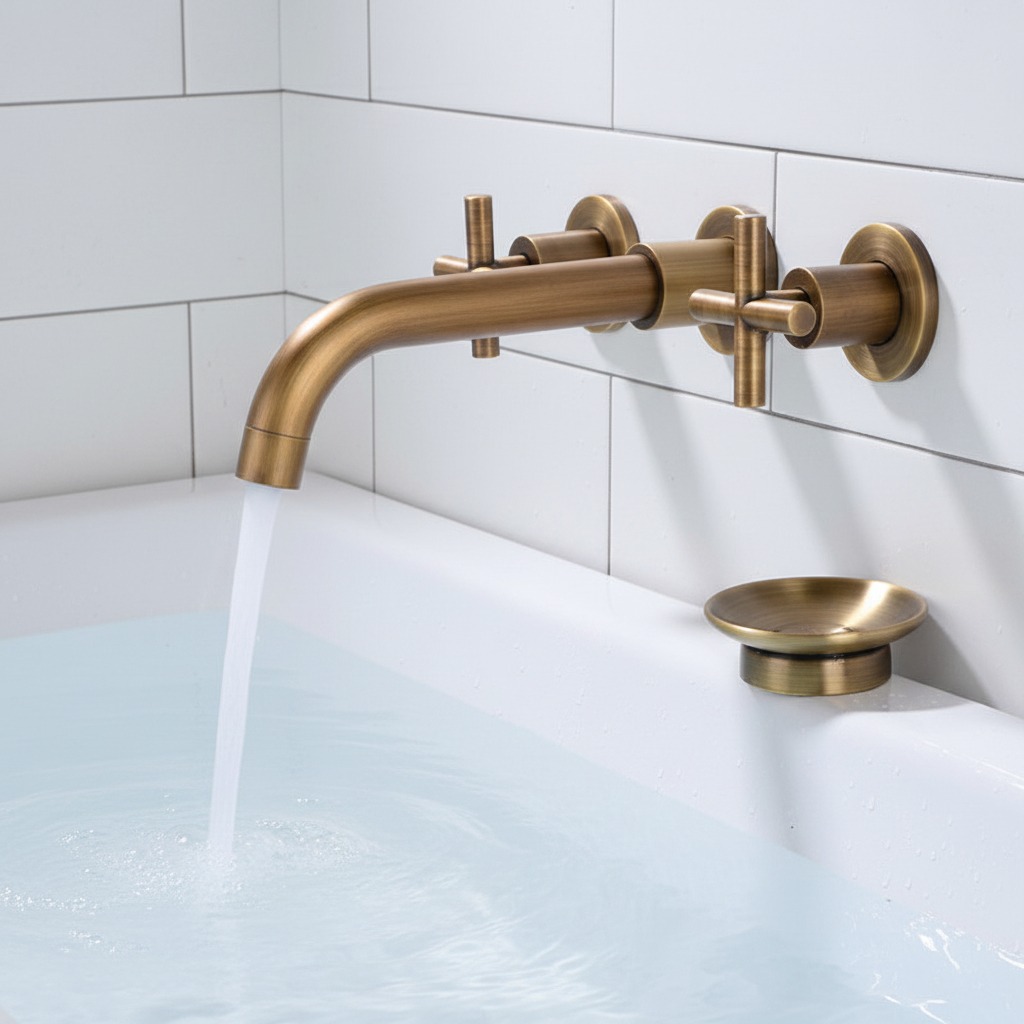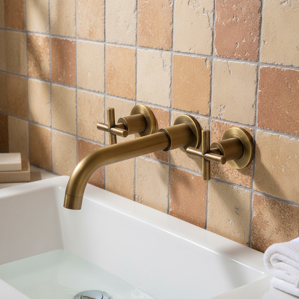 Deze Badique inbouw muurkraan in bronskleur is een perfecte keuze voor een warme, landelijke badkamer. Het klassieke ontwerp met kruisgrepen en de subtiele, geborstelde bronsafwerking zorgen voor een stijlvolle en tijdloze uitstraling.