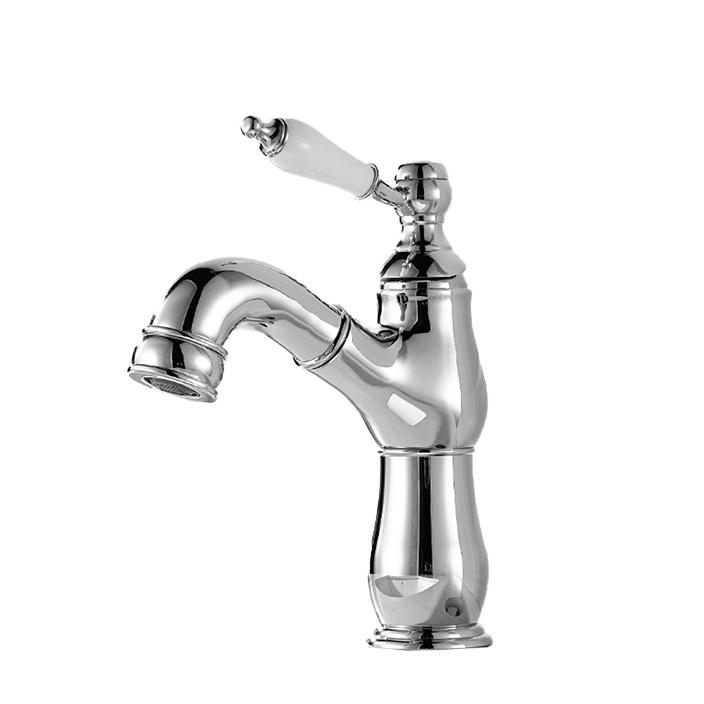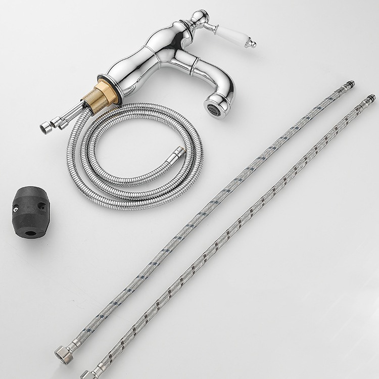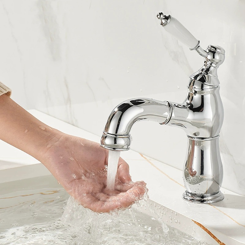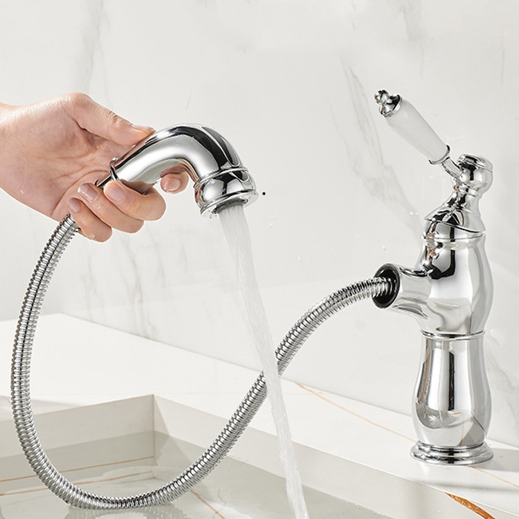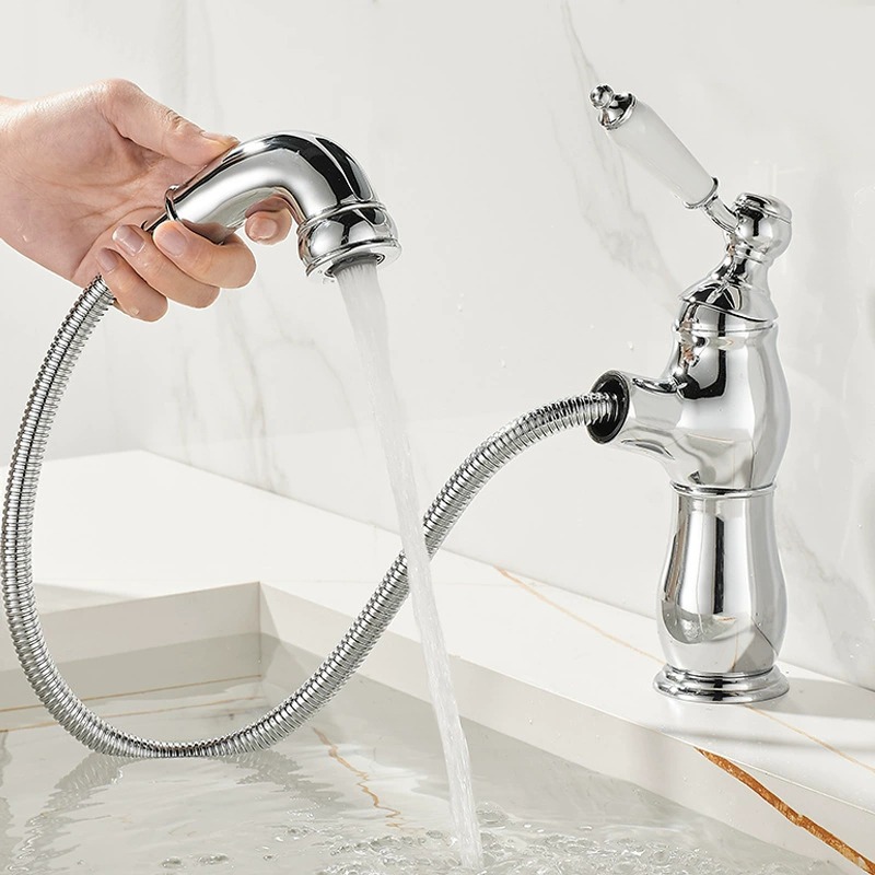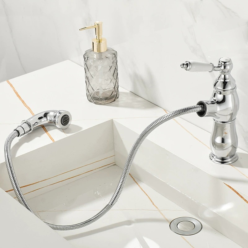 Deze elegante chromen wastafelkraan combineert een klassieke vormgeving met modern gebruiksgemak. Dankzij de uittrekbare uitloop met flexibele slang reinig je eenvoudig de wastafel of spoel je snel iets uit, ideaal voor dagelijks comfort in badkamer of toiletruimte.