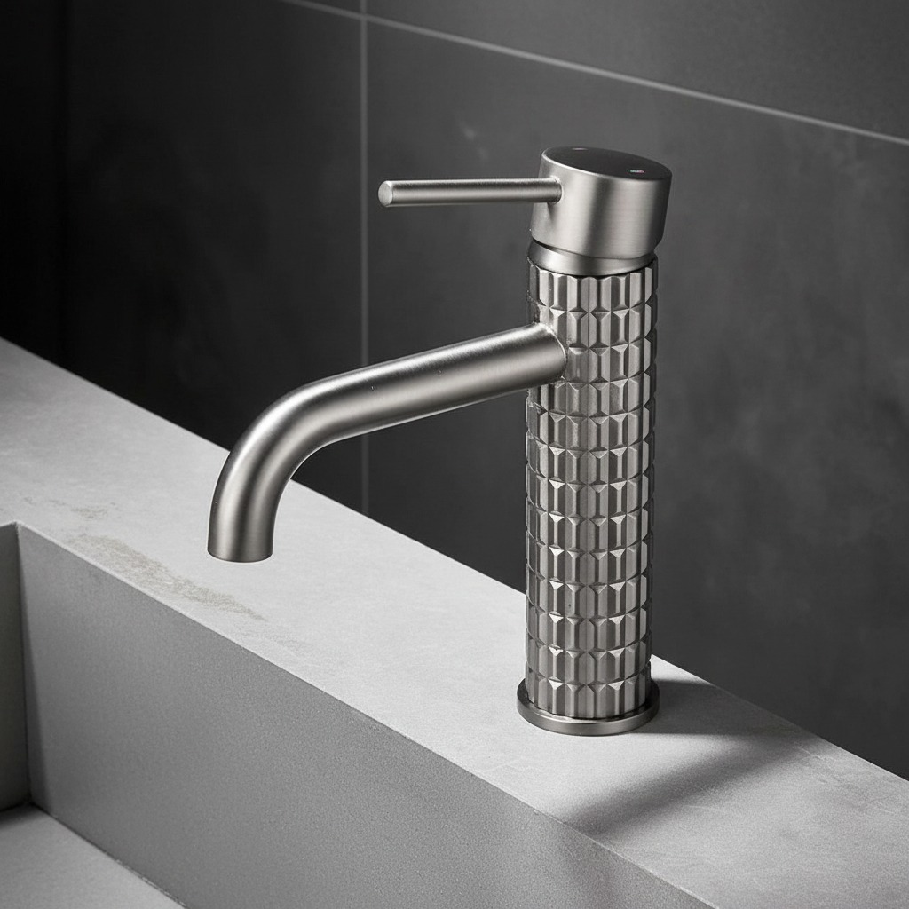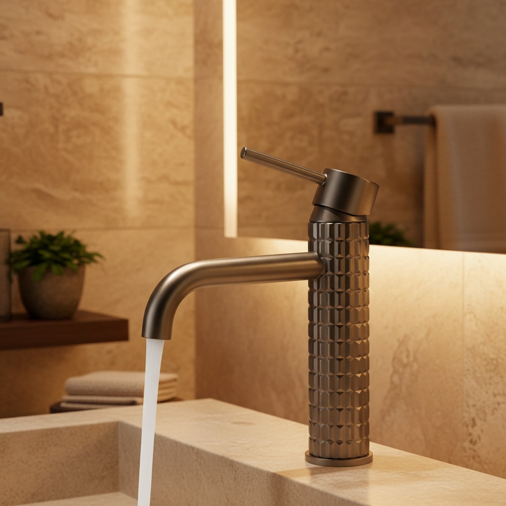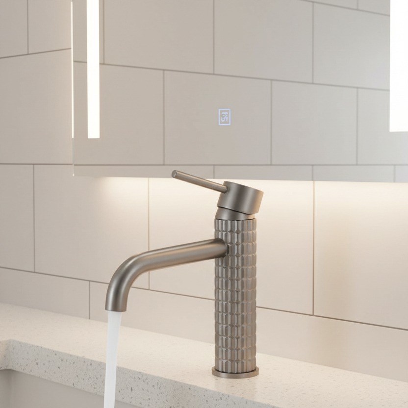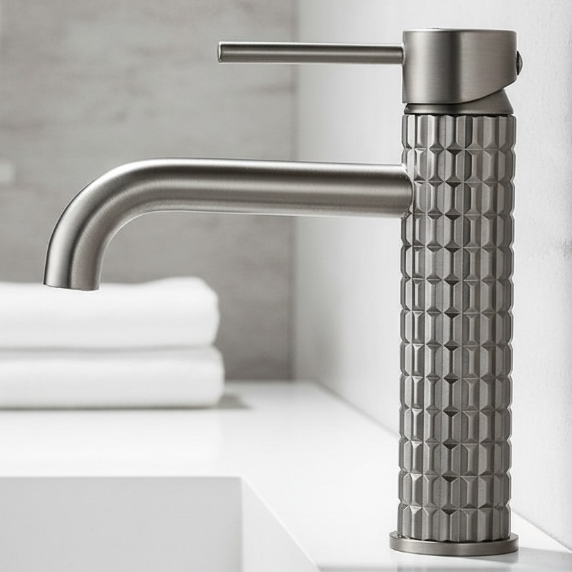Deze moderne wastafelkraan in gun metal uitvoering combineert een strak design met een robuuste uitstraling. De subtiel gebogen uitloop en de unieke geribbelde body zorgen voor een luxe en onderscheidende look in iedere badkamer of toiletruimte.