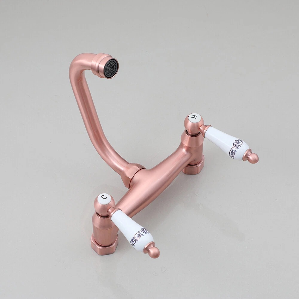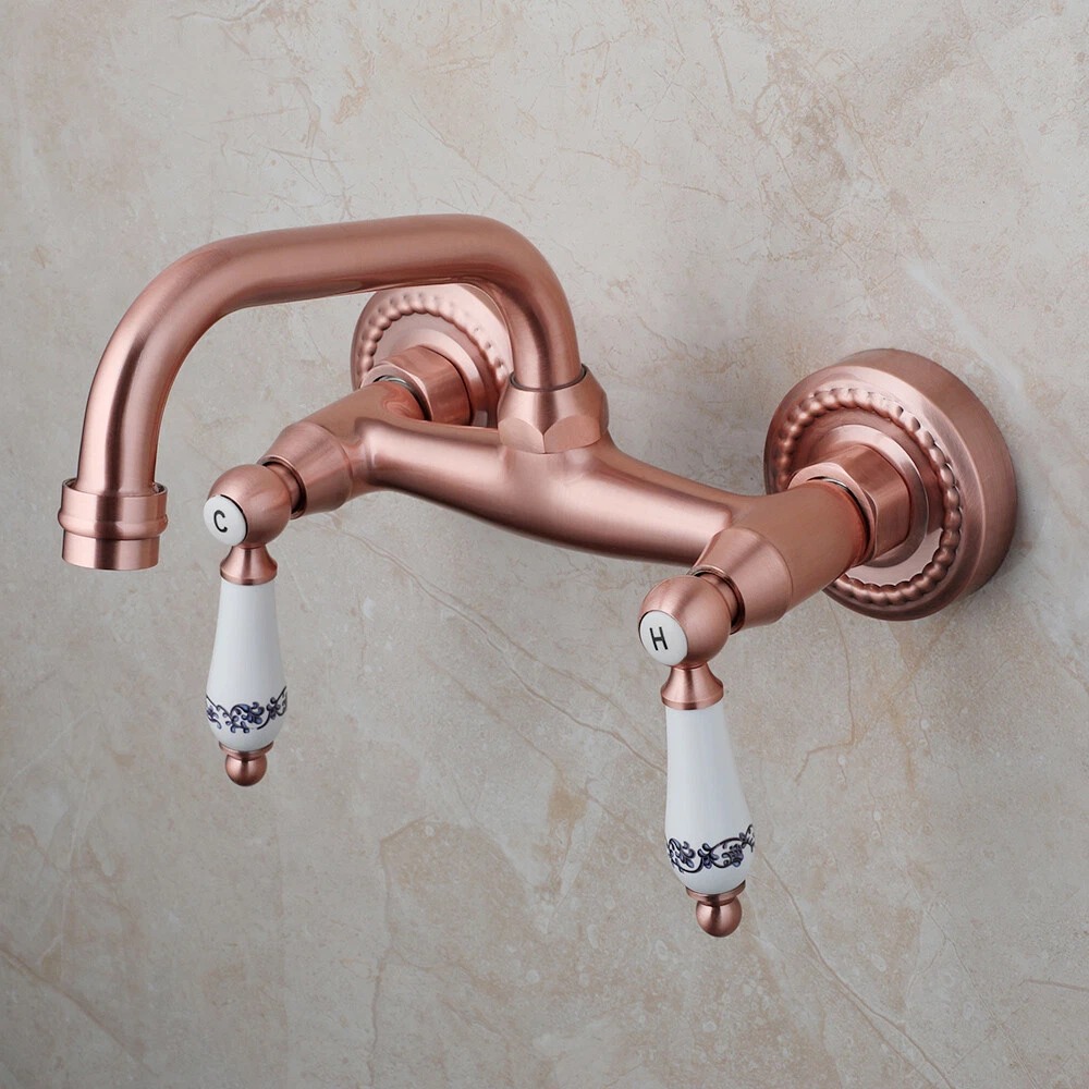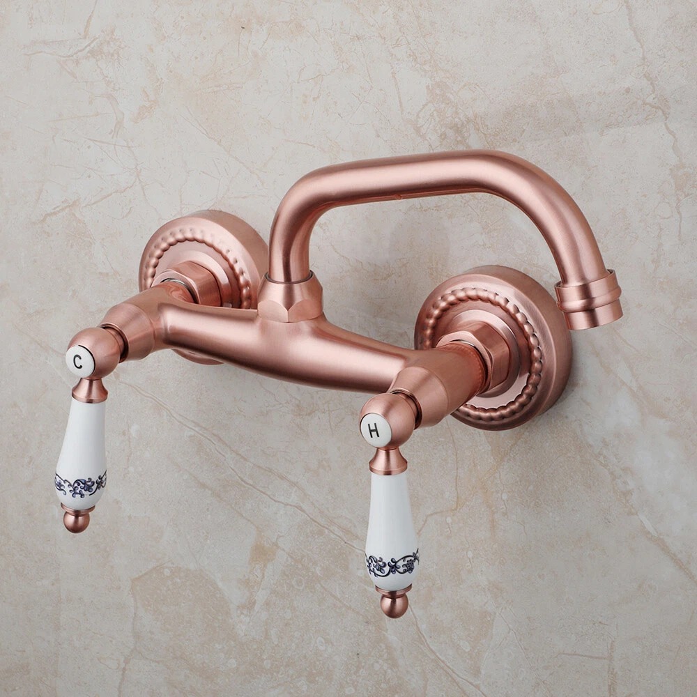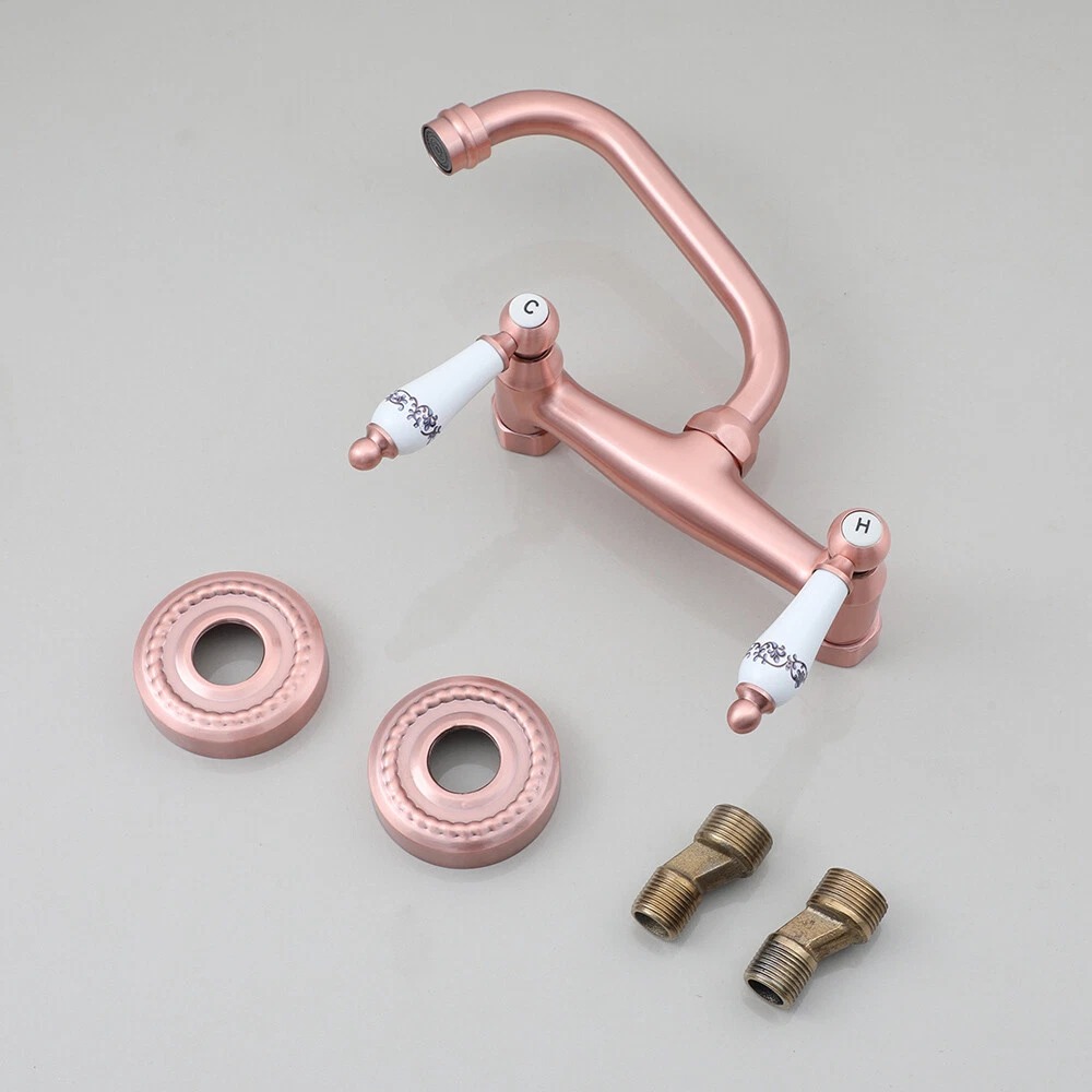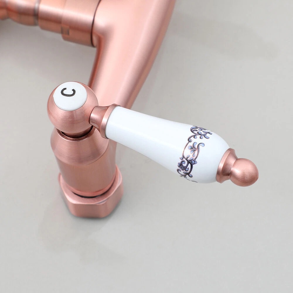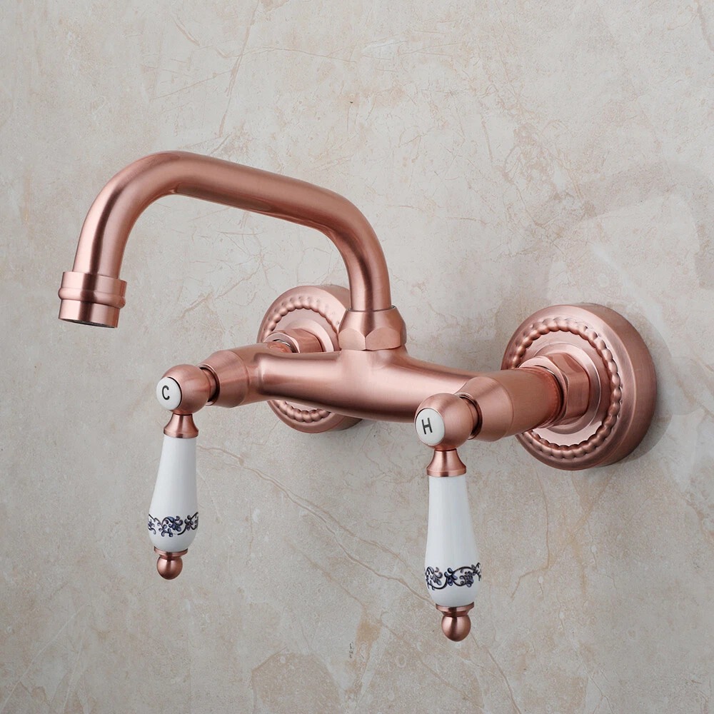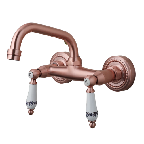 Deze koperkleurige muurkraan met landelijke uitstraling combineert klassieke charme met modern gebruiksgemak. De keramische handgrepen zorgen voor een authentieke look en een prettige bediening in badkamer of keuken.