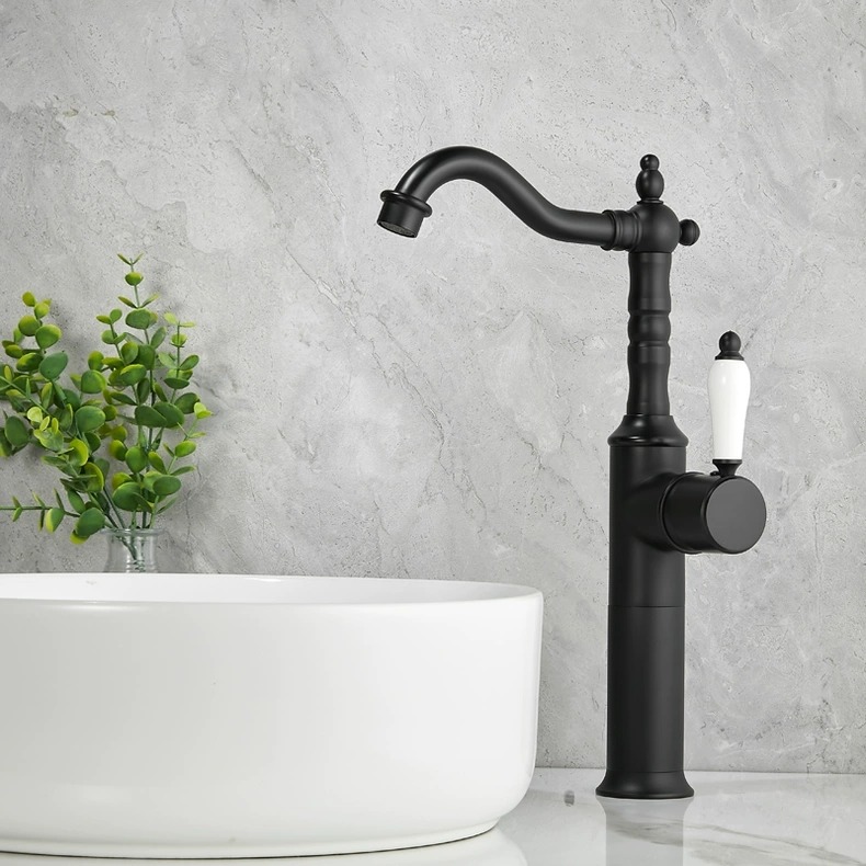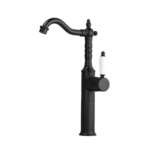 De kraan is vervaardigd uit massief messing en afgewerkt in mat zwart. De porseleinen greep vormt een stijlvol contrast en zorgt voor een comfortabele en nauwkeurige bediening. Dankzij het hoge model is deze kraan zeer geschikt voor opbouw waskommen.